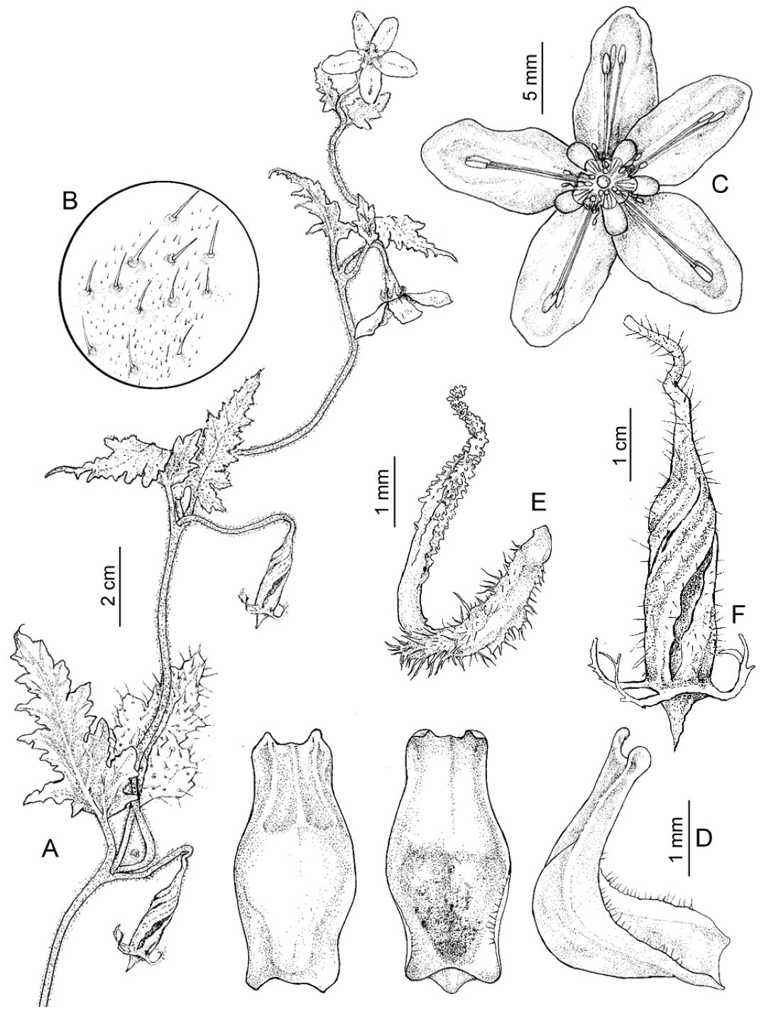 Hierbas volubles hasta de 1,50 m de alto, urticantes. Tallos densamente cubiertos por pelos gloquidiados, setas largas y setas cortas retrorsas, dispersas; corteza castaña a amarillenta. Hojas con pecíolos hasta de 4 cm; lámina aovada, pinnatilobada a pinnatisecta, hasta de 12 x 8 cm, base truncada a levemente deltoide o emarginada, ápice agudo, segmentos aovados, dentados a pinnatífidos, margen irregularmente serrado-dentado; haz provisto de setas cortas antrorsas y setas largas con la base ensanchada, a veces con incrustaciones de carbonato de calcio y generalmente ubicadas sobre cojinetes de células epidérmicas, envés densamente cubierto de tricomas gloquidiados y setas largas dispersas, principalmente sobre las nervaduras. Inflorescencias laxas, mono o dicasios. Flores péndulas, 5-meras. Pedicelos flexibles a rígidos, ca. 2,5 cm. Receptáculo obcónico, 10-13 mm; setoso. Cáliz deflexo; sépalos linear-lanceolados, dentados, ca. 3-3,5 mm; setosos. Corola expandida; pétalos ovados, cocleariformes, de 8-10 x 3-4 mm, anchamente alados; exteriormente setosos, interior glabrescente, margen ciliado; blancos. Escamas nectaríferas cimbiformes, subrectangulares en vista dorsal, de 3-3,5 x 1,5-2 mm, cara dorsal quillada; blancas; margen ciliado; ápice no engrosado, no diferenciado; cuello emarginado, redondeado; apéndices dorsales nulos. Estaminodios de 4-6 mm; densamente papilosos en el ápice y pilosos en la base, blancos, lengüeta basal breve, pilosa. Cápsula reflexa, oblonga, espiralada, hasta de 4 x 1 cm; densamente setosa.