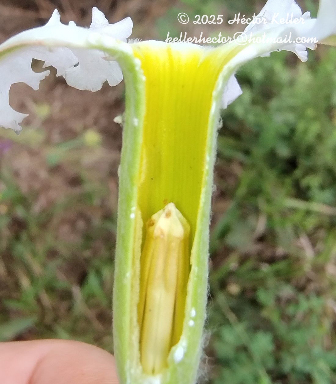 Hierba perenne, de 30-60 cm alt., provista de xilopodio profundo, surcado; tallos ascendentes, algo ramificados, marcadamente pilosos en sus partes jóvenes, glabrescentes a la madurez. Hojas subsésiles, opuestas, raramente tri-verticiladas, oblongas a oblongolanceoladas, de 1,5-3,5 x 0,3-1 cm, esparcidamente pilosas en el haz, albo-lanuginosas en el envés; ápice agudo y base levemente cordada a truncada; margen marcadamente revoluto y ondeado. Racimos de 1-3 flores; pedúnculo de 5-15 cm long.; brácteas lineal-lanceoladas de 0,2-0,4 cm long. Cáliz de lóbulos lanceolados de 0,8-1,4 cm long., levemente pubescentes en el exterior. Corola con la base contraída en un tubo de 4-6 cm long. por debajo de la inserción de los estambres; garganta cilíndrica de 1,5-3 cm long.; lóbulos asimétricos, oblicuamente ovados, de cerca de 2 cm long., con el margen crespo. Anteras de 1,2 cm long., marcadamente inclusas. Ovario ovoide de aprox. 3 mm long.; nectarios oblongos, comprimidos, más o menos unidos entre sí, de menor altura. Estilo filiforme de 4-6 cm long. Folículos de 10-20 cm long., levemente lanuginosos, glabrescentes. Semilla de cerca de 1 cm long., con penacho de pelos leonados de 2-2,5 cm long.