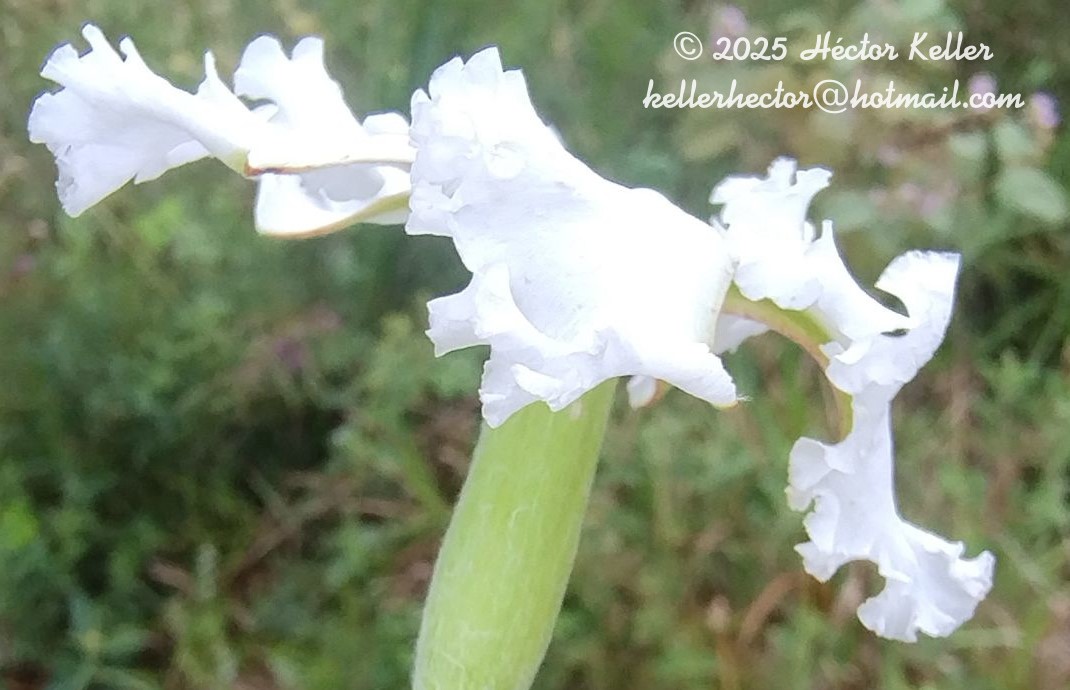 Hierba perenne, de 30-60 cm alt., provista de xilopodio profundo, surcado; tallos ascendentes, algo ramificados, marcadamente pilosos en sus partes jóvenes, glabrescentes a la madurez. Hojas subsésiles, opuestas, raramente tri-verticiladas, oblongas a oblongolanceoladas, de 1,5-3,5 x 0,3-1 cm, esparcidamente pilosas en el haz, albo-lanuginosas en el envés; ápice agudo y base levemente cordada a truncada; margen marcadamente revoluto y ondeado. Racimos de 1-3 flores; pedúnculo de 5-15 cm long.; brácteas lineal-lanceoladas de 0,2-0,4 cm long. Cáliz de lóbulos lanceolados de 0,8-1,4 cm long., levemente pubescentes en el exterior. Corola con la base contraída en un tubo de 4-6 cm long. por debajo de la inserción de los estambres; garganta cilíndrica de 1,5-3 cm long.; lóbulos asimétricos, oblicuamente ovados, de cerca de 2 cm long., con el margen crespo. Anteras de 1,2 cm long., marcadamente inclusas. Ovario ovoide de aprox. 3 mm long.; nectarios oblongos, comprimidos, más o menos unidos entre sí, de menor altura. Estilo filiforme de 4-6 cm long. Folículos de 10-20 cm long., levemente lanuginosos, glabrescentes. Semilla de cerca de 1 cm long., con penacho de pelos leonados de 2-2,5 cm long.