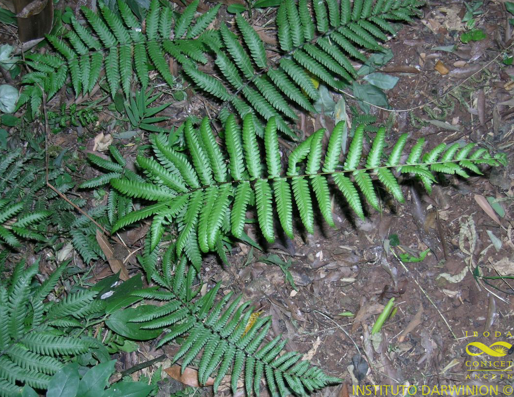 Rizomas rastreros, de 1-2 cm de diámetro, densamente escamosos en el ápice; escamas castaño-rojizas, linearlanceoladas, con pelos ramificados y simples. Frondes polísticas, subdimórficas, de 0,80-1,50 m de largo, las fértiles angostas y de mayor longitud; pecíolos pajizos o castaño-verdoso claros, 0,5- 0,6 veces la longitud total de la fronde, de 2-4 mm de diámetro, con pelos ramificados de pedicelos cortos, en baja densidad o glabros; láminas de contorno subelíptico o angostamente triangular, terminada en una pinna hastada o ápice pinnatífido, láminas fértiles de 12-25 cm de ancho, cartáceas a subcoriáceas, superficie adaxial lisa o frecuentemente escabrosa; raquis pajizo, pilosos en la haz, pelos ramificados rojizos o hialinos, pinnas apicales y medias linear-triangulares, las basales subelípticas, con el extremo agudo o atenuado, sésiles o cortamente pecioluladas, las fértiles de 1-2 cm de ancho, las estériles hasta de 3,5 cm de ancho, el par basal no o levemente reducido, por lo general reflexo, costa con pelos simples, setiformes, con aeróforos visibles en las plantas jóvenes; segmentos triangular-elípticos, subfalcados, agudos u obtusos, de 2,5-4 mm de ancho, margen entero subondulado, formado por una capa externa de células hialinas y una interna de células esclerenquimáticas continua o discontinua, con 8-13 pares de venas, el par basal libre, la vena basiscópica no alcanza el margen o connivente en el seno, apófisis membranoso en el seno, superficie de los segmentos glabra o con escasísimos pelos setiformes en la cóstula y venas del lado adaxial. Yemas prolíferas sobre el raquis y costas del lado adaxial, comúnmente apicales pero también basales. Soros circulares, medios, con indusios diminutos, pilosos, esporangios glabros. Esporas amarillas, crestado-aladas.
