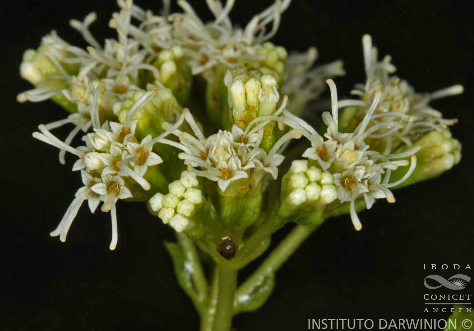 Subarbustos de 1-1,5 m de alto, frecuentemente apoyantes, hojosos hasta el ápice. Hojas pecioladas, pecíolos de 1-4 cm de largo, con brotes de ramitas nuevas en sus axilas simulando estípulas; láminas ovadas, de 5-12 × 3-6 cm, redondeadas o cordadas en la base, agudas en el ápice, aserrado-crenadas en el margen, ligeramente pubescentes en ambas caras. Capítulos numerosos, dispuestos en cimas corimbiformes que en conjunto forman panojas triangulares. Involucro acampanado, ca. 5 × 3 mm; filarios 10-15, en 2 series, lanceolados, agudos, todos de la misma longitud, excepto los 2 ó 3 exteriores. Flores 10-15, corolas blancas o amarillentas, ca. 3 mm de largo. Aquenios ca. 2,2 mm de largo, híspidos. Papus blanco.