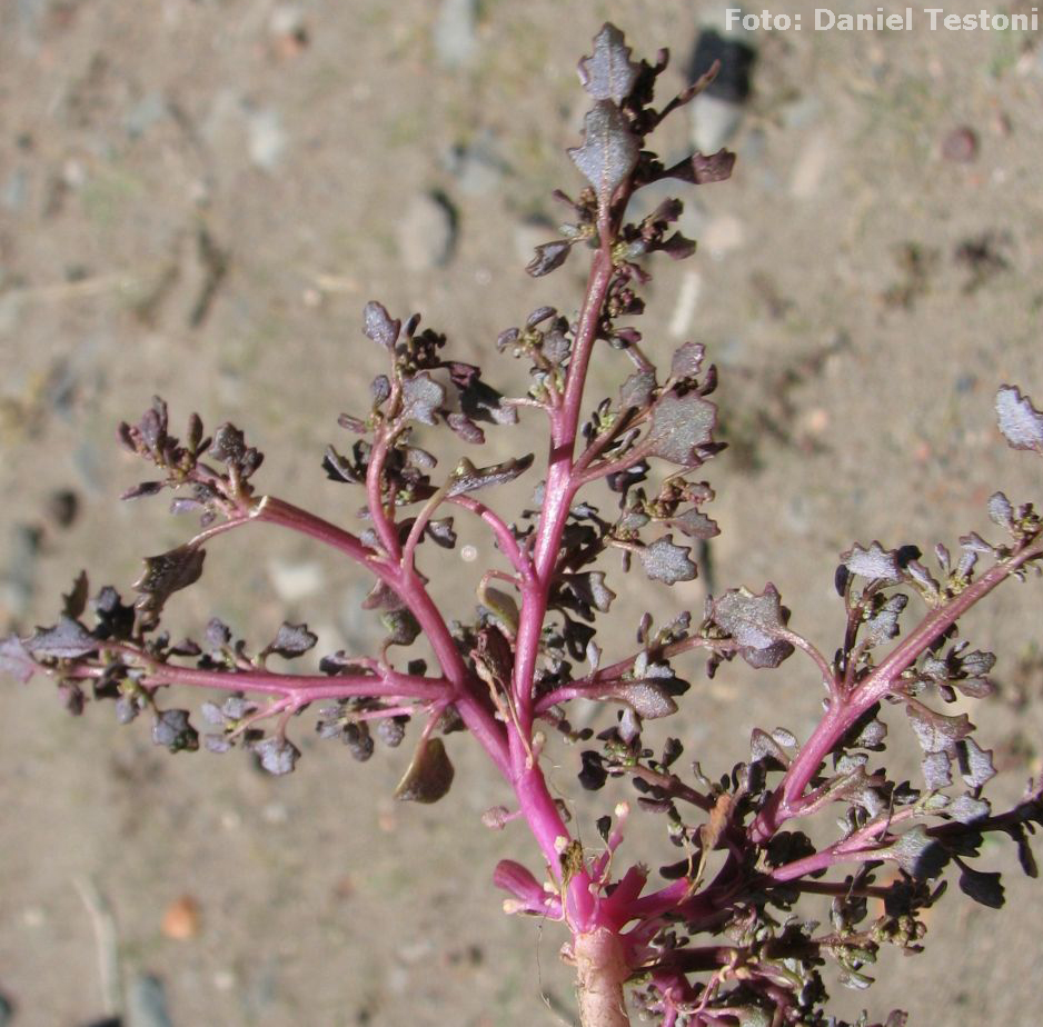 Hierbas anuales, carnosas, con varias ramas efusas, rojizas, hasta de 15 cm de largo. Hojas alternas, largamente pecioladas (pecíolo ca. igual largo que la lámina), romboideo-lanceoladas, ca. 1-4 × 0,5-0,7 cm; margen irregularmente lobulado; base cuneada; ápice agudo. Inflorescencias en glomérulos paucifloros axilares. Flores perfectas, dimorfas: las terminales con sépalos 3-5 y estambres 3-5; las laterales con sépalos 2-4 y estambre 1; en ambos tipos de flores los sépalos son naviculares, membranáceos, con pigmentaciones purpureas en el ápice, unidos sólo en la base, cubriendo parcialmente al fruto a la madurez. Frutos utrículos lenticulares a globosos, de 0,8-0,9 mm de diámetro; pericarpo membranáceo, delgado, adherido a la semilla. Semillas verticales, raramente horizontales, lenticulares a globosas, castaño rojizas; tegumento punteado.