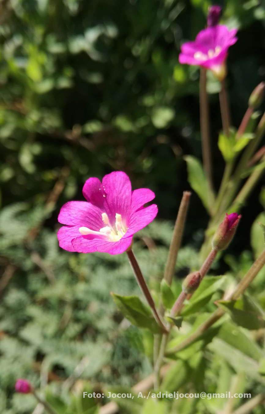 Hierba perenne, rizomas largos y gruesos con catáfilas coriáceas dispersas. Tallos erectos de 30-120 cm de altura, 1,5-8 mm de diám., muy ramificados en la mitad superior con gran cantidad de ramilletes axilares; ± densamente cubiertos de pelos simples, de 1-2 mm, patentes, brillantes, y -en menor proporción- con pelos glandulares de menos de 0,5 mm; parte inferior glabrescente, de color pajizo brillante. Hojas opuestas, generalmente alternas en la parte superior, elípticas, de 1,9-10(-12,5) × 0,5-3 cm, algo decurrentes hasta semiamplexicaules -especialmente en las hojas inferiores-, de borde irregularmente serrulado (con dientes ± ganchudos) y ápice agudo, con pelos no glandulares de 0,5-1,5 mm, patentes, brillantes, concentrados en nervios y margen y dispersos en el resto de la lámina, y pelos glandulares inconspicuos. Inflorescencia racemosa, panícula, con 10 a 22 flores, pedicelos florales de (3-)5-10(-12) mm. Botones florales ovoides o elipsoides de 6-8 mm. Flores actinomorfas. Sépalos de contorno liso, de 5,5-9,5 mm, apiculados, densamente cubiertos de pelos glandulares (< 0,2 mm). Pétalos de contorno liso, de (8-)9-13 mm, con escotadura de 1-4 mm, rosado-purpúreos a morados. Zona de unión de piezas florales con un cinturón de pelos blanquecinos. Estambres inclusos, 4 largos y 4 cortos; anteras de 2,1-2,6 mm, amarillentas. Ovario levemente tetrágono de 13-25 × 1-2 mm; estilo de aproximadamente 10 mm; estigma exerto 4-lobado, blanco-cremoso, con ramas de 1,7-2,2 mm. Cápsula estrecha y alargada, levemente curva, más o menos tetrágona, de 4-6 cm, densamente cubierta de pelos glandulares, patentes; pedicelos de 9-15 mm. Semillas obovoides, de 0,9-1,3 mm, castaño-grisáceas y con papilas prominentes; coma de 8-12 mm
