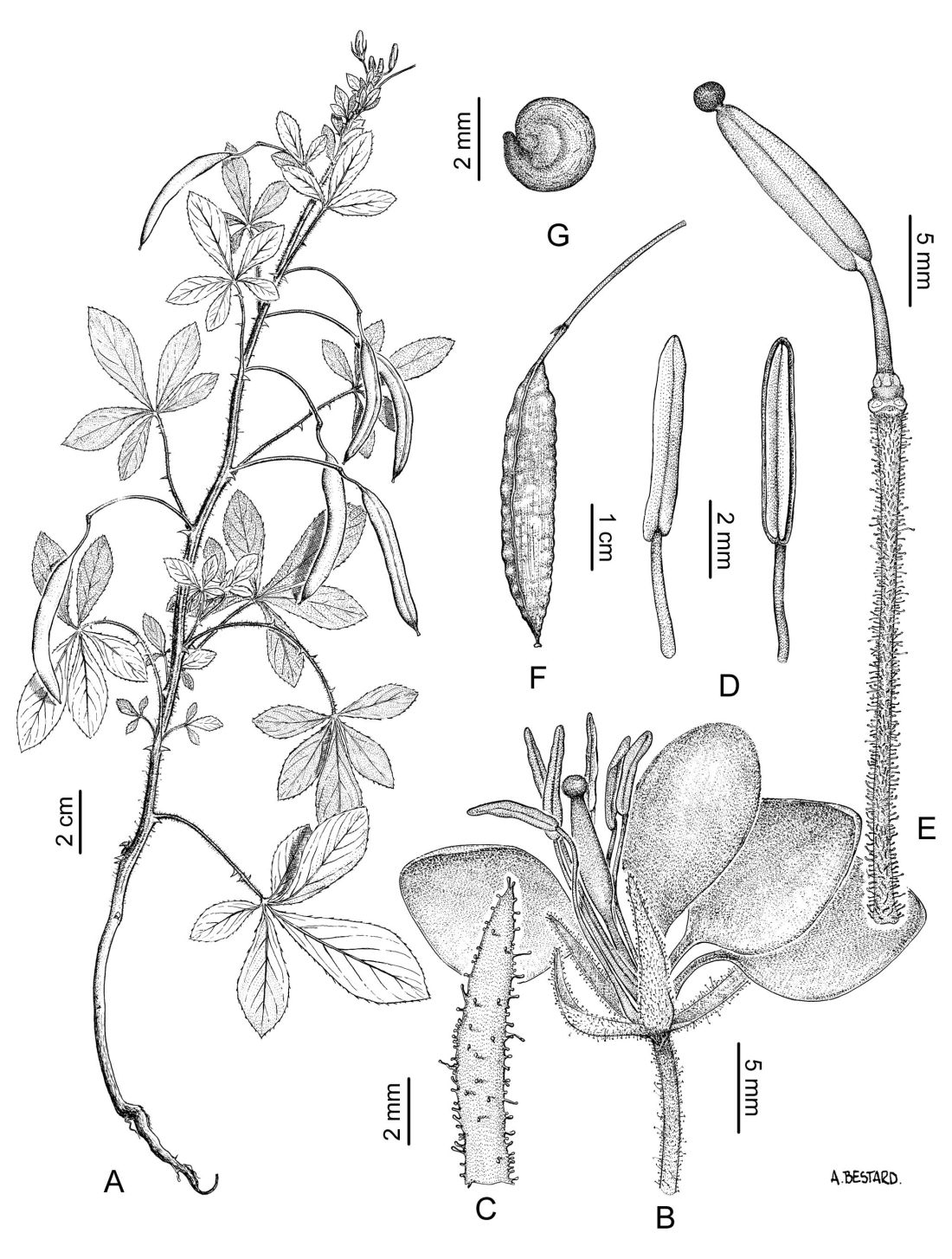 A. Planta. B. Flor. C. Sépalo. D. Estambres, vista dorsal y ventral. E. Pistilo después de la antesis con ginóforo y pedúnculo floral. F. Fruto. G. Semilla.