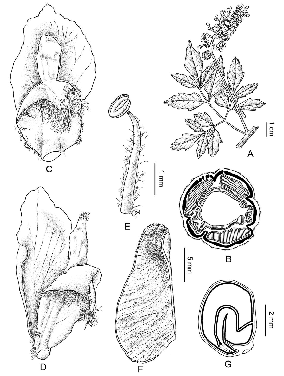 A. Rama florífera. B. Tallo, corte transversal. C. Pétalo posterior, cara interna. D. Pétalo anterior, cara interna. E. Estambre de flor estaminada. F. Mericarpo. G. Semilla, corte longitudinal.