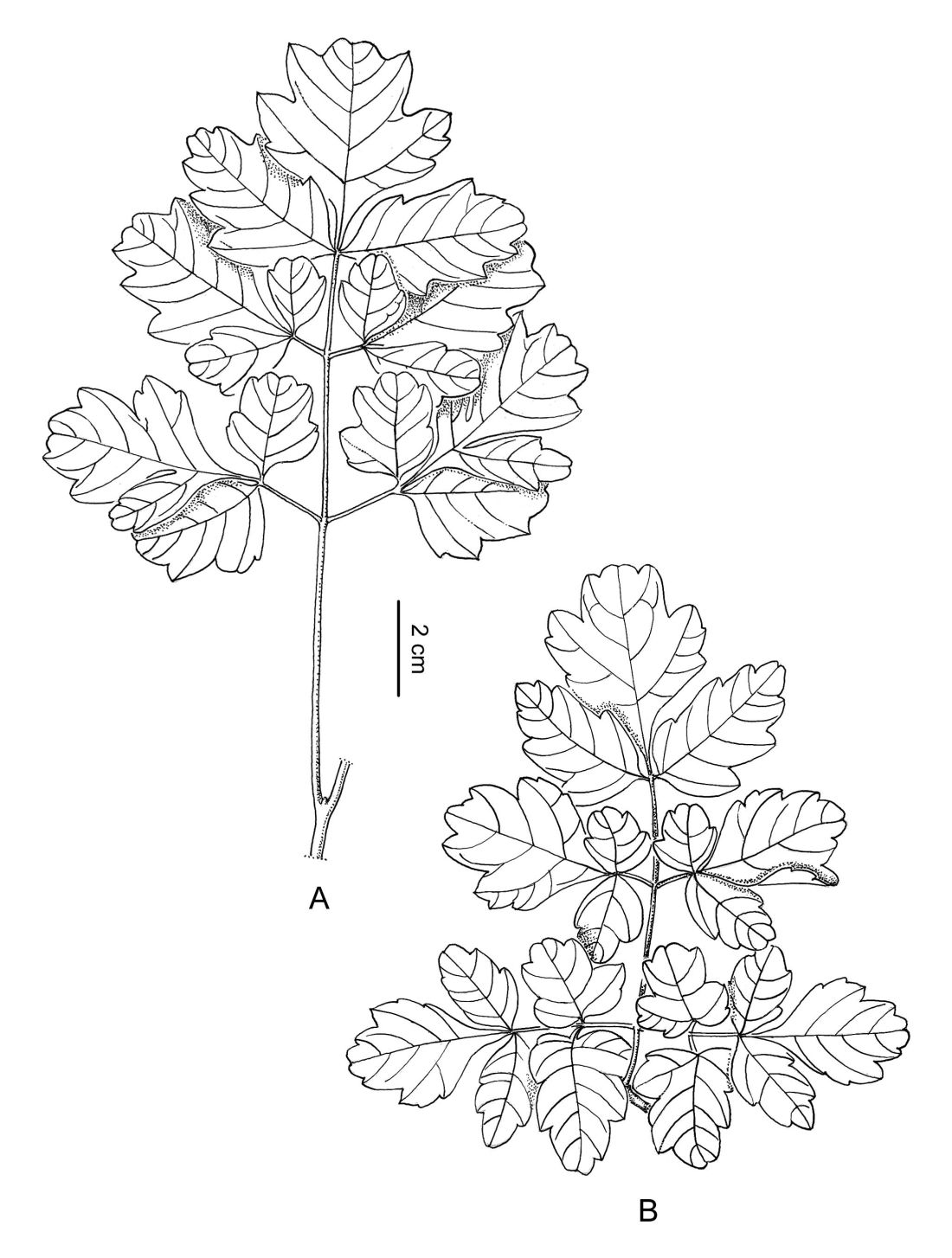 A. Detalle de hoja, lámina imparipinnada, 3-yugada, las yugas basales 3-folioladas. B. Detalle de hoja, lámina imparipinnada 3-yugada, las yugas basales 5-folioladas.