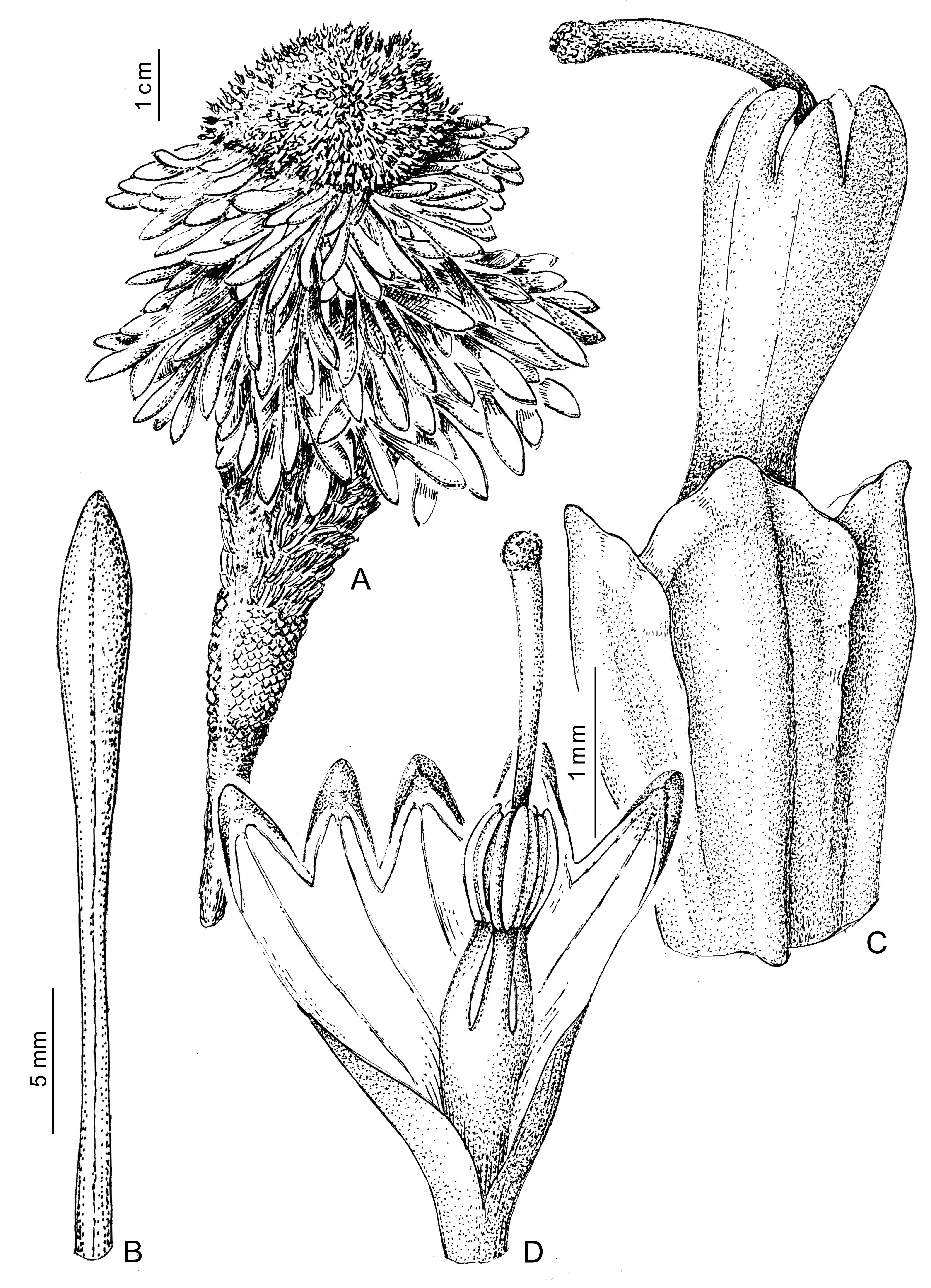 Hierbas geófitas con un tallo subterráneo grueso y carnoso (caudex), que puede ramificarse para producir un grupo de pequeñas rosetas, de 2-7 cm de alto × 8-10 cm de diámetro, justo a nivel del suelo. Hojas carnosas, densamente rosulado-imbricadas, enteras, estrechamente obovadoespatuladas, de 1,2-4 × 0,2-0,4 cm, margen entero. Cefalodio central principal desagregado hacia la periferia. Ramas laterales cortas, gruesas y erectas, reducidas a los pedúnculos escapiformes de las inflorescencias laterales. Cefalodios laterales apretados alrededor del central, formando una estructura similar a una coliflor. Sépalos orbiculares, de 0,5 mm de diámetro. Tubo estaminal-corolino de 2 mm de largo, tubo corolino de 0,2 mm de largo, lóbulos corolinos triangulares, de 0,8 mm de largo; anteras de 0,6 mm de largo. Cipselas (inmaduras) prismáticas, de 2,5 mm de largo, con 5 carenas.