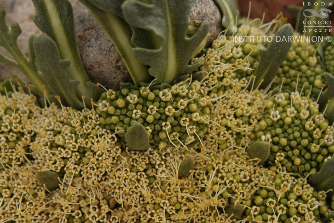 Hierbas hemicriptófitas de 2,5-10 cm de alto × 5-20 cm de diámetro. Hojas rosuladas, espatuladas; pecíolo de 2-3 cm de largo; lámina pinnatilobada, de 1-6 × 1-3 cm, base atenuada, margen entero, ápice redondeado. Cefalodio central sésil, grupos cimosos periféricos desagregados numerosos, sésiles y connados a progresivamente separados, pedunculados e involucelados. Cefalodios laterales sobre ramas laterales escapiformes, gruesas y cortas. Involucro con base fusionada pateliforme o cupuliforme y lóbulos triangulares. Receptáculo hemisférico, volviéndose globoso con la maduración de los frutos. Brácteas del receptáculo libres. Sépalos triangulares, hinchados, de 0,4 mm de alrgo. Tubo estaminal-corolino de 1,52 mm de largo, tubo corolino de 1-1,5 mm de largo, lóbulos corolinos de 1 mm de largo. Tubo estaminal de 0,5 mm de largo, filamentos de 0,5-0,7 mm de largo, anteras oblongas, de 1,2 mm de largo, tecas de base agudo-sagitada. Cipselas prismáticas, de 2-8,5 mm de largo, con 5 carenas lisas, expandidas, esponjosas, y sépalos integrados a las carenas del fruto.