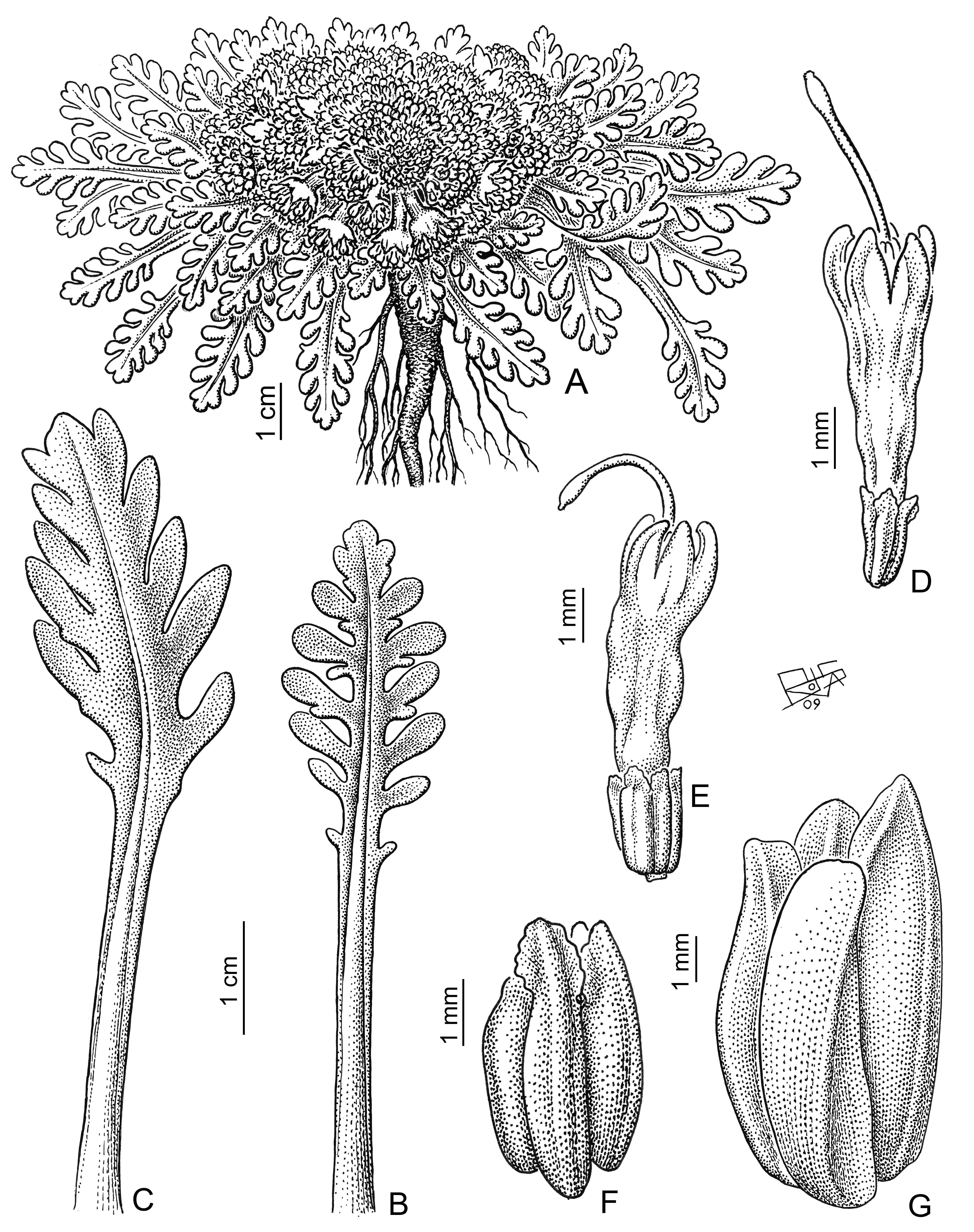 Hierbas hemicriptófitas de 2,5-10 cm de alto × 5-20 cm de diámetro. Hojas rosuladas, espatuladas; pecíolo de 2-3 cm de largo; lámina pinnatilobada, de 1-6 × 1-3 cm, base atenuada, margen entero, ápice redondeado. Cefalodio central sésil, grupos cimosos periféricos desagregados numerosos, sésiles y connados a progresivamente separados, pedunculados e involucelados. Cefalodios laterales sobre ramas laterales escapiformes, gruesas y cortas. Involucro con base fusionada pateliforme o cupuliforme y lóbulos triangulares. Receptáculo hemisférico, volviéndose globoso con la maduración de los frutos. Brácteas del receptáculo libres. Sépalos triangulares, hinchados, de 0,4 mm de alrgo. Tubo estaminal-corolino de 1,52 mm de largo, tubo corolino de 1-1,5 mm de largo, lóbulos corolinos de 1 mm de largo. Tubo estaminal de 0,5 mm de largo, filamentos de 0,5-0,7 mm de largo, anteras oblongas, de 1,2 mm de largo, tecas de base agudo-sagitada. Cipselas prismáticas, de 2-8,5 mm de largo, con 5 carenas lisas, expandidas, esponjosas, y sépalos integrados a las carenas del fruto.