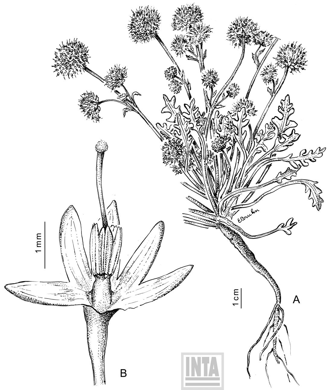 Hierbas hemicriptófitas de 2,5-10 cm de alto × 5-20 cm de diámetro. Hojas rosuladas, espatuladas; pecíolo de 2-3 cm de largo; lámina pinnatilobada, de 1-6 × 1-3 cm, base atenuada, margen entero, ápice redondeado. Cefalodio central sésil, grupos cimosos periféricos desagregados numerosos, sésiles y connados a progresivamente separados, pedunculados e involucelados. Cefalodios laterales sobre ramas laterales escapiformes, gruesas y cortas. Involucro con base fusionada pateliforme o cupuliforme y lóbulos triangulares. Receptáculo hemisférico, volviéndose globoso con la maduración de los frutos. Brácteas del receptáculo libres. Sépalos triangulares, hinchados, de 0,4 mm de alrgo. Tubo estaminal-corolino de 1,52 mm de largo, tubo corolino de 1-1,5 mm de largo, lóbulos corolinos de 1 mm de largo. Tubo estaminal de 0,5 mm de largo, filamentos de 0,5-0,7 mm de largo, anteras oblongas, de 1,2 mm de largo, tecas de base agudo-sagitada. Cipselas prismáticas, de 2-8,5 mm de largo, con 5 carenas lisas, expandidas, esponjosas, y sépalos integrados a las carenas del fruto.