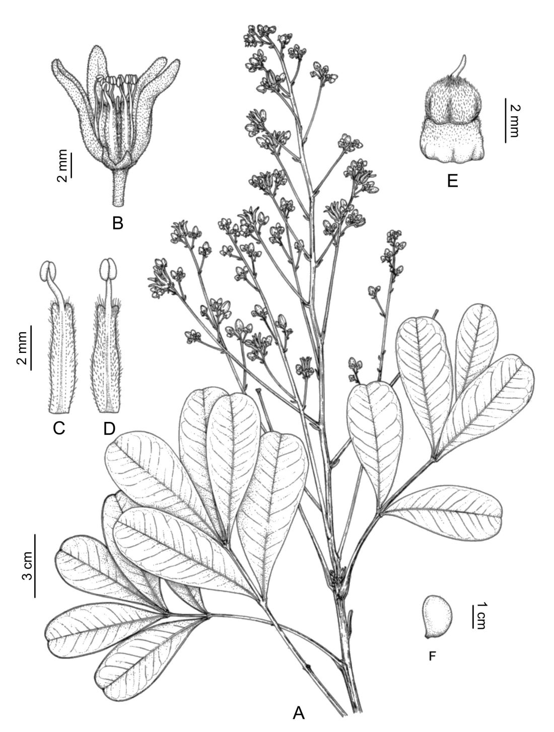 A. Rama florífera. B. Flor, con un pétalo removido. C. Estambre, vista dorsal. D. Estambre, vista ventral. E. Gineceo sobre ginóforo. F. Fruto. Tomado de Fl. Paraguay (Simaroubaceae): fig. 6. 1987.