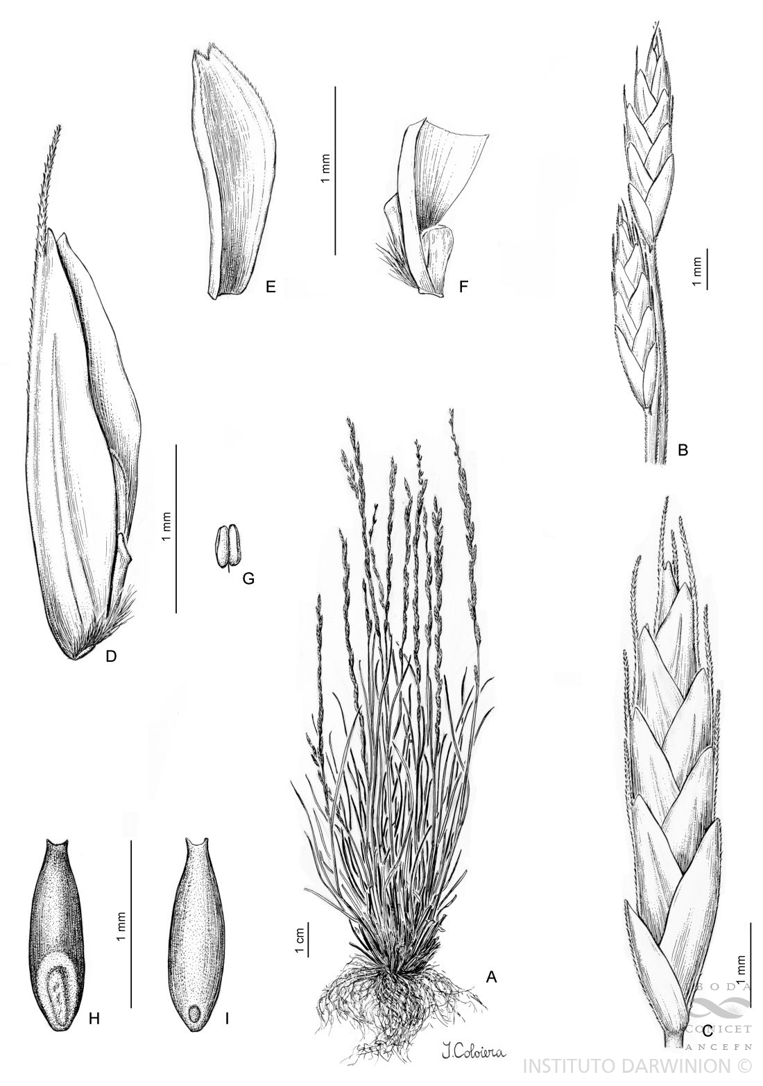 Plantas perennes, cespitosas; cañas de (5-)10-25 cm de alto, erectas, filiformes; vainas inferiores deshaciéndose en fibras al envejecer, glabras o con pelos aislados; lígulas breves, menores de 0,5 mm de largo, membranáceas, margen ciliado, con mechón de pelos a los costados; láminas conduplicadas de 2-5 cm x 0,5-1 mm, escabrosas y con pelos largos, hasta de 2 mm, esparcidos en la cara adaxial, glabras en la abaxial, ápice escabroso. Inflorescencia en racimo terminal de 4-8 cm de largo, grácil, exerto, glabro, las espiguillas alternas en 2 series sobre uno de los lados del raquis. Espiguillas de 6-10 x 1-1,5 mm, 5-12-floras, violáceo-plomizas, adosadas al eje, subsésiles; raquilla frágil, artejos comprimidos lateralmente, generalmente de 0,8 mm de largo, desarticulándose en bisel, cicatriz de abscisión estrechamente elíptica; glumas lanceoladas, múticas; gluma inferior de 1-2 mm de largo; gluma superior de 1,4-2,4 mm de largo; lemma de 2-3,2 mm de largo, 3-nervia, ápice 2-lobado, el nervio central prolongado en un mucrón o una arista recta de (0,4-)0,6-2 mm de largo, los laterales desvanecidos hacia el ápice; pálea de 2,1-2,2 x 0,75 mm, 2-carinada, ½ a ¾ del largo de su lemma, ápice 2-dentado; lodículas 2, generalmente de 0,2 mm de largo, truncadas, enervias; estambres 3, anteras de 0,3-0,5 mm de largo; cariopsis de 1,4-1,6 mm de largo, subtrígona, castaña, estrechamente ovoide, libre entre las glumelas, sin surco ventral notable; embrión de 0,5-0,7 mm de largo; hilo basal, oval.