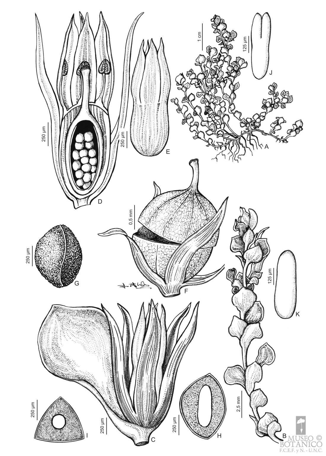 A. Planta. B. Sector de rama. C. Flor, vista lateral en axila de una hoja. D. Flor, corte longitudinal. E. Corola, vista lateral. F. Fruto dehiscente. G. Semilla. H. Corte longitudinal por semilla. I. Transcorte por semilla. J-K. Embrión, vista frontal y lateral, respect.