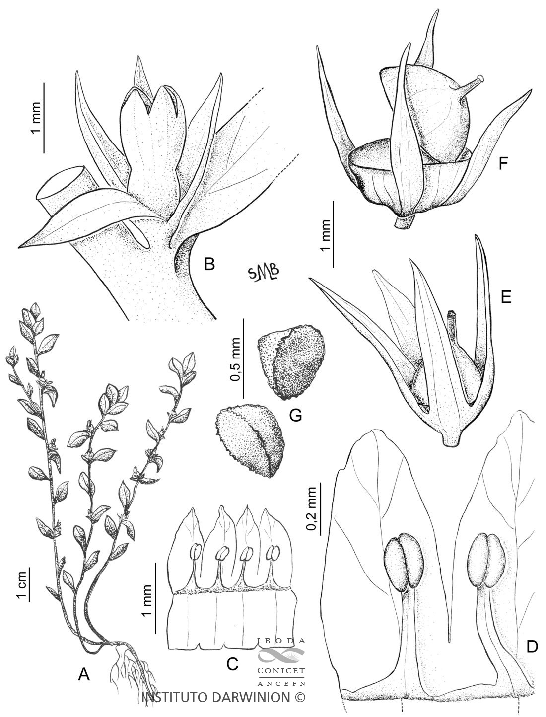 Hierbas anuales, de 1-18 cm de largo, con tallos ramificados desde la base, radicantes, erectos o decumbentes, estriados longitudinalmente, glabros, rojizos. Hojas alternas, a veces las inferiores opuestas, ovadas, elípticas a lanceoladas, raramente suborbiculares, de 2-10 × 1-5 mm, cartáceas a membranáceas, glabras, de ápice agudo-mucronado, base atenuada a cuneada, margen entero; sésiles o con pecíolos hasta de 0,5 mm de largo. Flores solitarias, axilares, sésiles o con el pedicelo hasta de 1 mm de largo; cáliz 4-5-partido, con los segmentos lanceolados a lineares, de 1,5-4 × 0,3-0,7 mm, de ápice acuminado, margen hialino; corola urceolada, de menor longitud que el cáliz, tubo de 0,4-0,5 mm de largo, con 4-5 lóbulos ovado-lanceolados, de 1,5-3 × 0,5-1 mm, de ápice agudo a acuminado, blancos o verdosos y con glándulas negras densamente agrupadas en la base; estambres 4-5, con filamentos de 1,5-2 mm de largo, soldados a la corola y formando un tubo ca. 0,5 mm de largo, con glándulas en la porción basal y glabro en el resto de la superficie, anteras de contorno elipsoide, de 0,2-0,3 mm de largo; ovario globoso, ca. 0,5 mm de largo, estilo filiforme, de 0,7-1 mm de largo, estigma capitado. Fruto una cápsula globosa, de 1-2,5 mm de diámetro, de dehiscencia circuncisa, generalmente con la corola adherida a la porción apical del fruto. Semillas numerosas, subtetraédricas, de 0,4-0,5 mm de largo, finamente granuladas a papilosas, castañas.