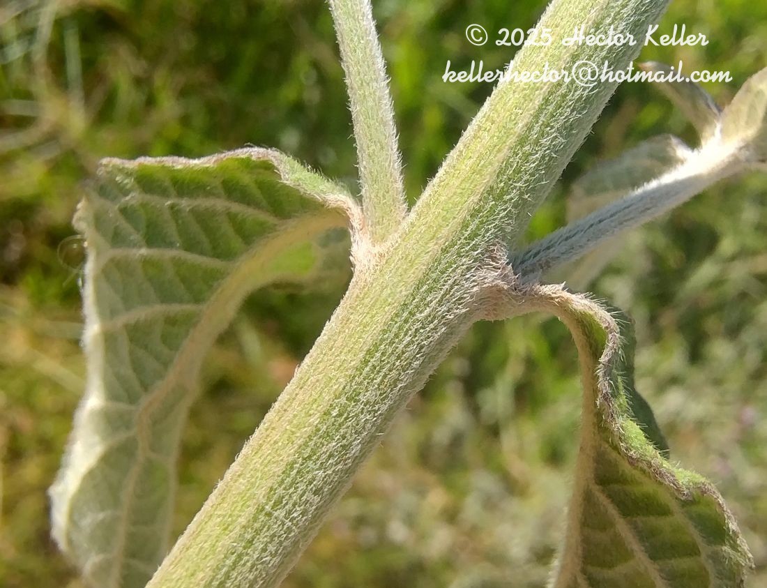 Hierbas anuales, erectas, de 30-60(-120) cm de alto, con raíz pivotante y tallos estriados, pubescentes, con pelos cortos y aplastados, hojosos hasta la inflorescencia. Hojas sésiles, ovadas u oval-lanceoladas, de 5-11 × 2-3,5 cm, atenuadas hacia la base en un breve pseudopecíolo, agudas en el ápice, aserradas o denticuladas, membranáceas, haz algo áspera con pelos finos con base prominente y persistente, estrigosa, envés cubierto de pelos sedosos rectos. Capítulos sésiles, axilares, reunidos en cincinos laxos, axilares, que se disponen en una panícula terminal amplia, hasta de 40 cm de largo; brácteas de la inflorescencia foliáceas, oval-lanceoladas, progresivamente más cortas hacia el ápice de las ramas, de 1,4-2,1 cm de largo. Involucro acampanado, de 6-8 mm de alto; filarios en 5-6 series, de 3,7-6,3 × 0,6-1 mm, los externos linear-lanceolados, a veces algo recurvados, los restantes lanceolados, acuminados, escariosos, lustrosos, pubescentes, con pelos adpresos, dorso rosado o púrpura. Flores 21-23; corolas purpúreas o liláceas de 6,3-7 mm de largo, glabras. Aquenios turbinados, de 1-1,5 mm de largo, costados, pubescentes. Papus blanco, la serie interna de 5-6 mm de largo, la externa de 0,7-1 mm de largo.