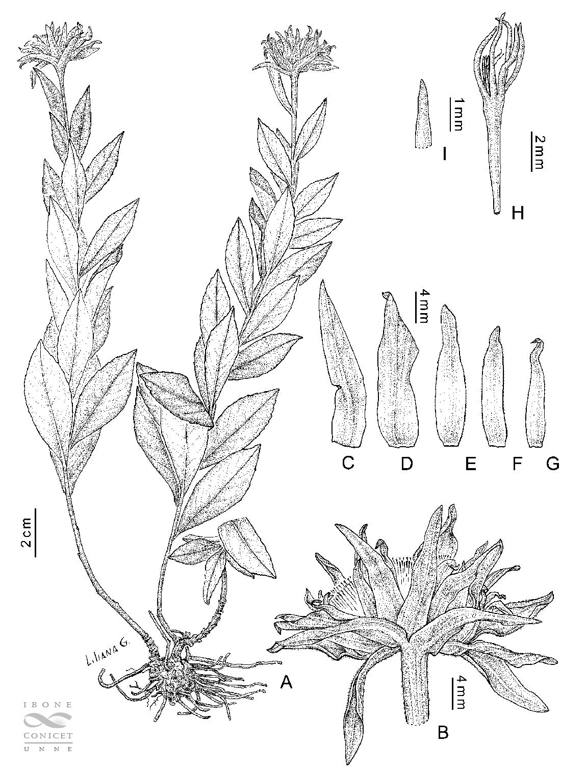 A. Planta. B. Capítulo. C-D. Filarios internos. E. Filario intermedio. F-G. Filarios externos. H. Corola con detalle del ápice del estilo y estambres. I. Ápice del lóbulo de la corola.