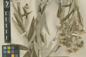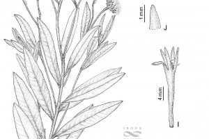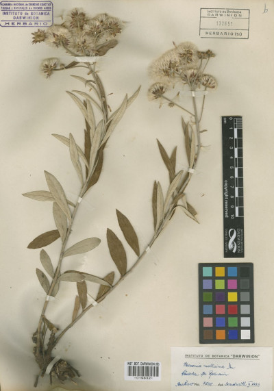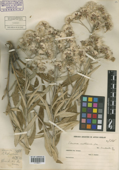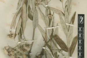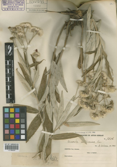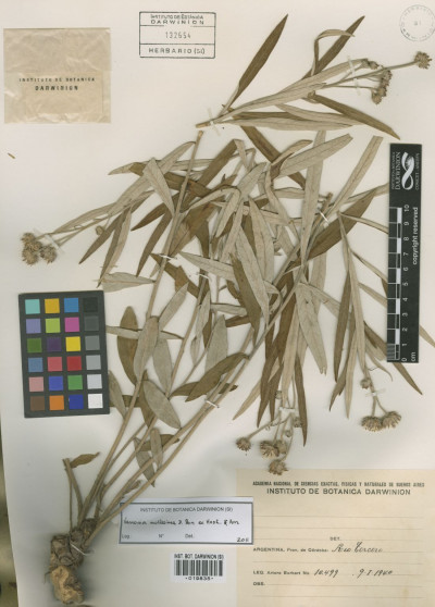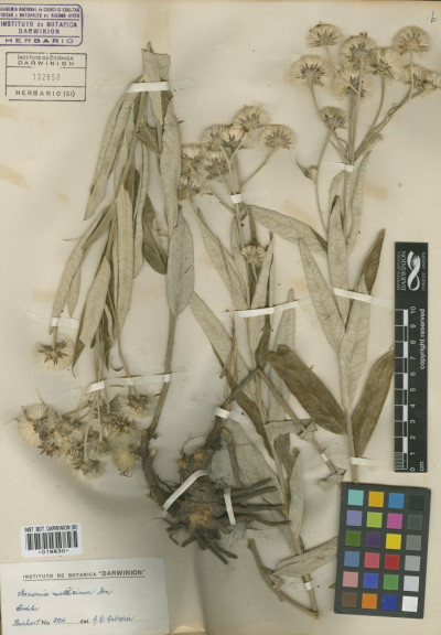 Subarbustos de 40-80 cm de alto, con xilopodio grueso del que nacen tallos erectos, foliosos, densamente albo-tomentosos. Hojas sésiles, lanceoladas u ovado-lanceoladas, de 7-12 × 1-3 cm, atenuadas en la base, agudas en el ápice, enteras, subcoriáceas, discoloras, haz glabrescente, lustrosa, envés albotomentoso. Capítulos grandes, largamente pedunculados, dispuestos en el ápice de las ramas en cimas corimbiformes laxas, desnudas. Involucro hemisférico, de 6-12 × 9-20 mm; filarios en 4-5 series, lanceolados, agudos, mucronados, mucrón glabro y oscuro, los externos lanuginosos, los internos laxamente tomentosos. Flores 40-60; corolas violáceas de 14-20 mm de largo. Aquenios seríceo-pubescentes, de 3-4 mm de largo. Papus blanco, serie externa setácea, de 7-8 mm de largo, serie exterior corta, plana.