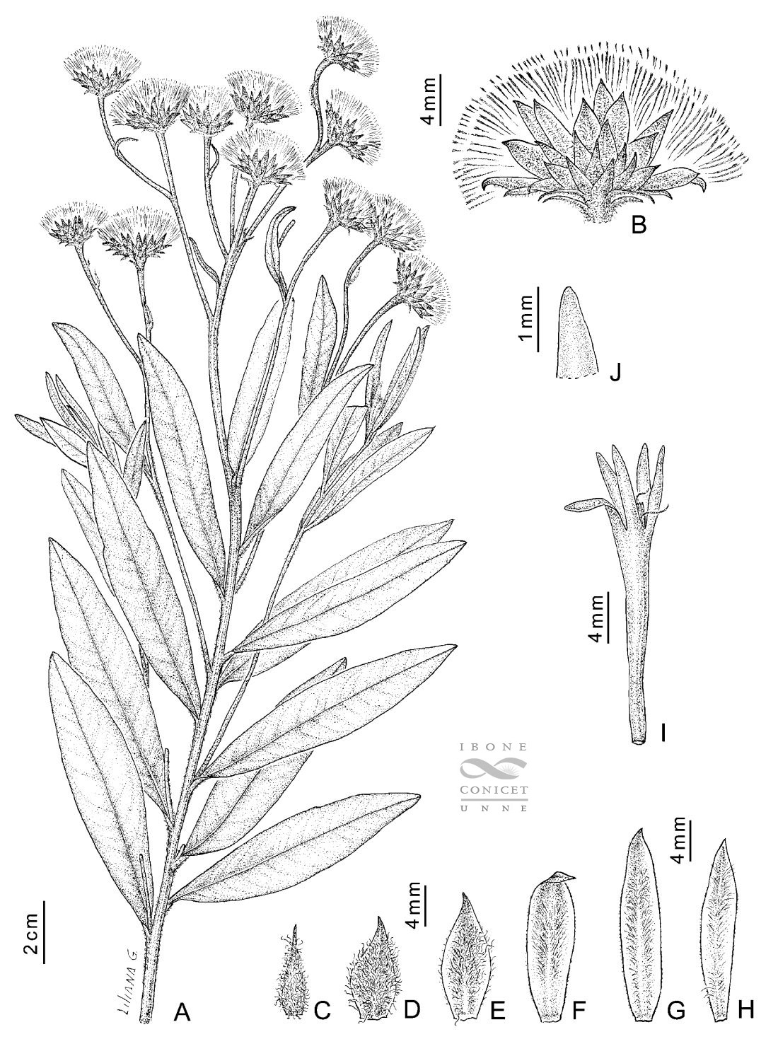 A. Parte superior de la planta. B. Capítulo. C-D. Filarios externos. E-F. Filarios intermedios. G-H. Filarios internos. I. Corola con detalle del ápice del estilo y estambres. J. Ápice del lóbulo de la corola.
