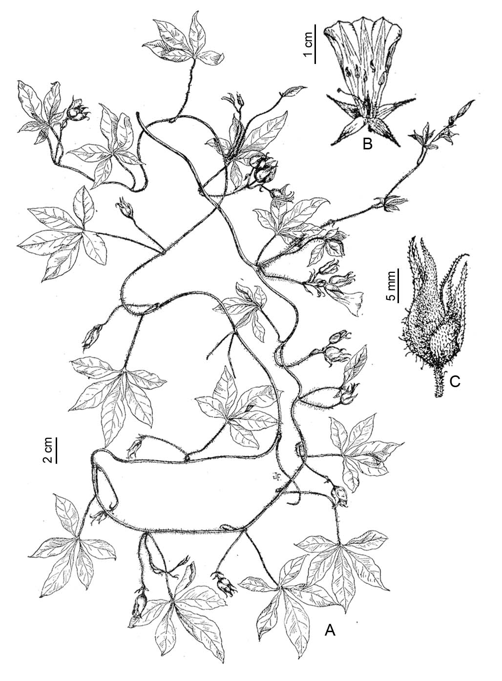 Plantas trepadoras, volubles; tallos cilíndrícos, hirsutopilosos. Hojas pecioladas, 5-palmatisectas o palmaticompuestas, folíolos elípticos, de 5 × 1,5 cm, mucronados, borde entero o dentado, con peciólulo hasta de 5 mm de largo, con pelos glandulares, en cantidad variable, sobre las nervaduras de la cara inferior. Inflorescencia en cimas 1-7-floras; brácteas florales lineares; botón agudo. Flores con sépalos de 1,2-2 cm de largo, obovados, acuminados, cubiertos de largos pelos hirsutos o adpresos y pelos glandulares; corola ca. 2,5-3 cm de largo, blanca; estambres desiguales, de 12-14 mm de largo; estilo de 15-17 mm de largo; ovario 3-4 locular, 3-4-ovulado. Cápsula ca. 7,5 mm de diámetro, acompañada por los sépalos no ampliados, 3-4-locular, 3-4-seminada. Semillas ca. 4,5 mm de largo, negras, con algunos pelos cortos.