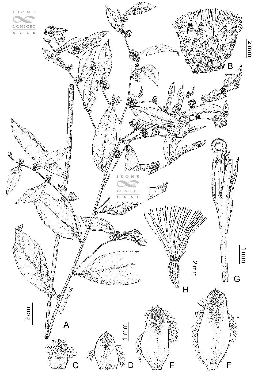 A. Parte superior de la planta. B. Capitulo. CD. Filarios externos. E. Filario intermedio. F. Filario interno. G. Corola con detalle del ápice del estilo y estambres. H. Aquenio y papus.