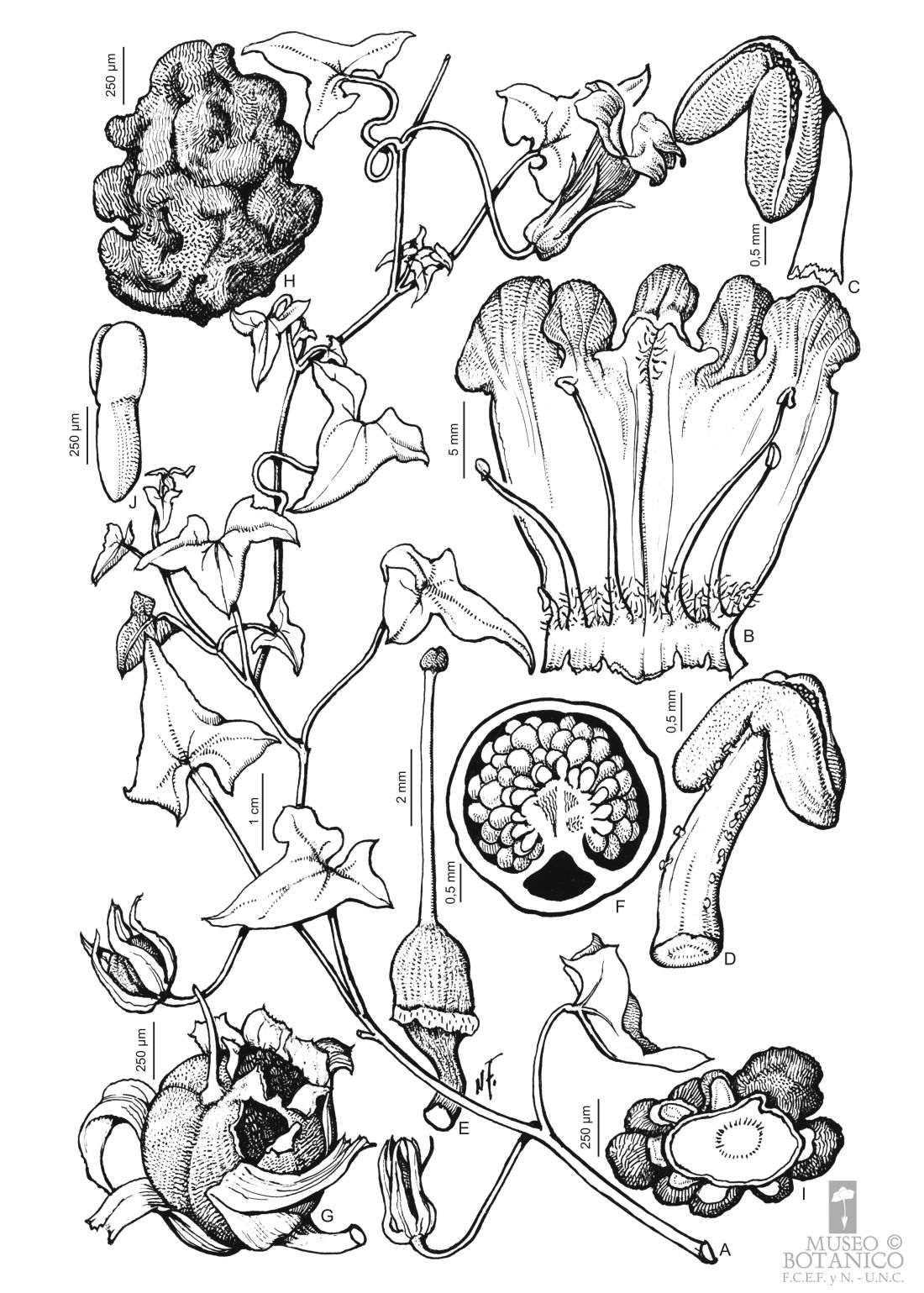 A. Sector de rama. B. Corola desplegada. C-D. Estambres, vistas lateral y ventral, respect. E. Gineceo. F. Transcorte por ovario. G. Fruto dehiscente. H. Semilla. I. Transcorte por semilla. J. Embrión.