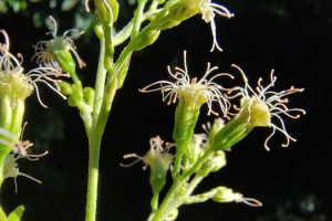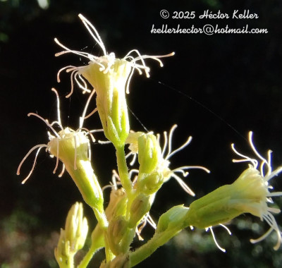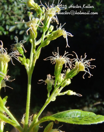 Arbustos o arbolitos hasta de 7 m de alto. Hojas pecioladas, pecíolos de 1-1,8 cm de largo, láminas ovadas, de 8-12 × 3,5-5 cm, redondeadas en la base, acuminadas en el ápice, aserradas en el margen, 5-nervadas desde la base, glabras. Capítulos muy numerosos, dispuestos en panojas piramidales de cimas. Involucro acampanado, ca. 5 mm de alto; filarios 10, en 2 series, todos de la misma longitud, más 2 ó 3 externos cortísimos, lanceolados, agudos en el ápice. Flores ca. 15, corolas blancas, ca. 5 mm de largo. Aquenios ca. 3 mm de largo, híspidos sobre las aristas. Papus blanco.