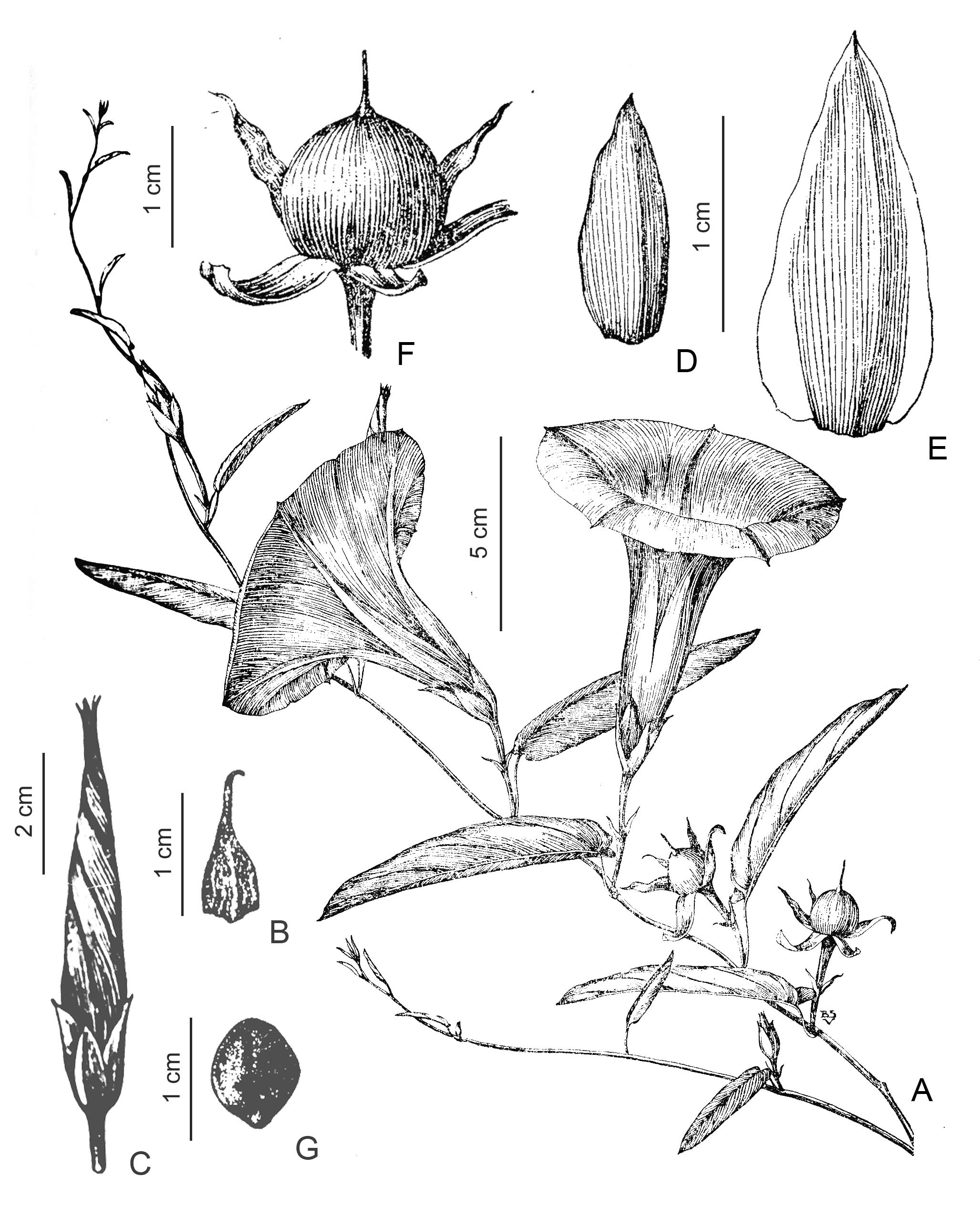 Plantas decumbentes con ápices volubles, glabras; tallos ca. 1,5 mm de diámetro. Hojas pecioladas, angostas, agudas, lanceoladas (a veces ovadas), mucronadas, de base redondeada o truncada, raro subcordada, de 2-10 × 0,5-4,5 cm, nervaduras prominentes en el epifilo. Flores solitarias sobre pedicelos de 230 mm de largo, gruesos; brácteas florales ovado-lanceoladas, ca. 3,5 mm de largo; botones ovoideos, agudos; sépalos elípticos u ovado-elípticos, con mucrón rojizo notable, los exteriores agudos, de 7-13 × 4-6 mm, los interiores obtusos, de 12-17 × 5-8 mm; corola infundibuliforme rosada, de 5-8 cm, glabra; estambres de 20-35 mm, anteras sagitadas de 6-8 mm; estilo de 20-26 mm.