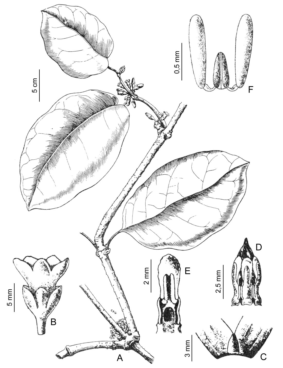 A. Rama florífera. B. Flor. C. Coléter en el cáliz. D. Corona y ginostegio. E. Antera. F. Polinario. Tomado de Lilloa 13: 28, fig. 3. 1947 (sub Marsdenia macrophylla).