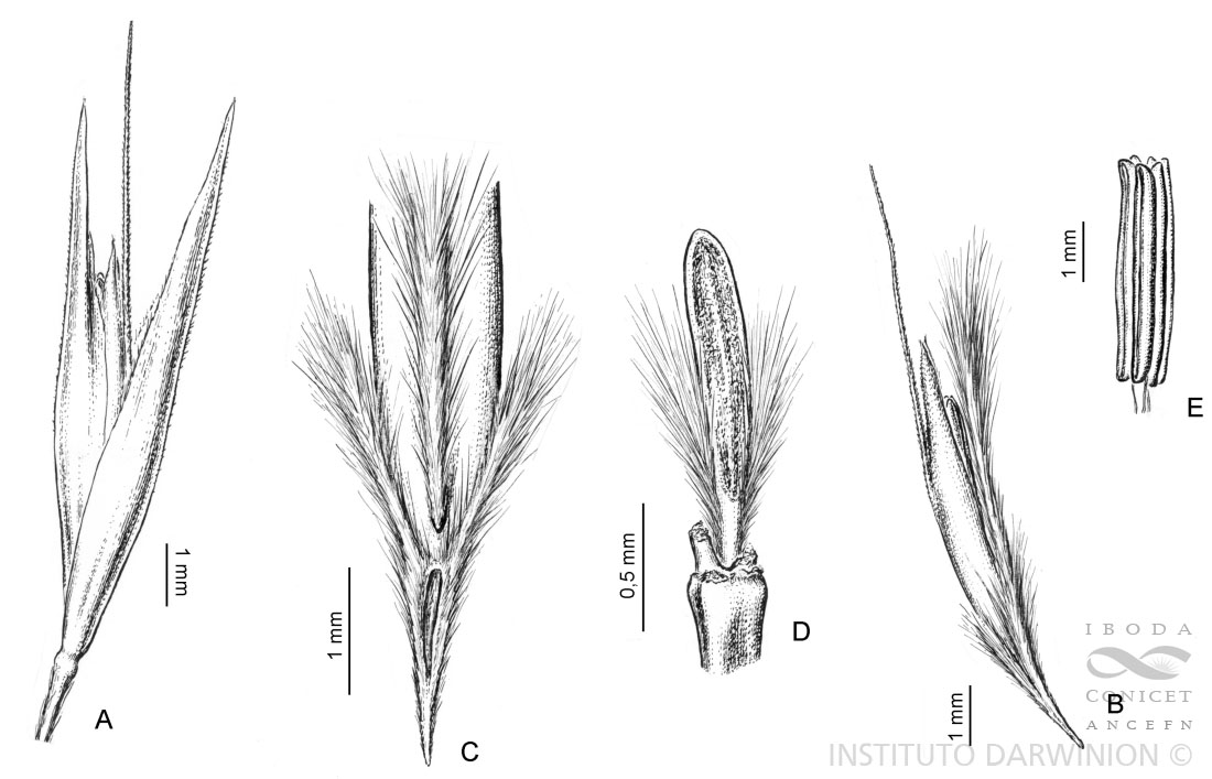 A. Espiguilla, vista lateral. B. Antecio, vista lateral. C. Parte basal del antecio mostrando el callo y parte de la raquilla. D. Artejo inferior de la raquilla y parte del pedicelo. E. Estambres.