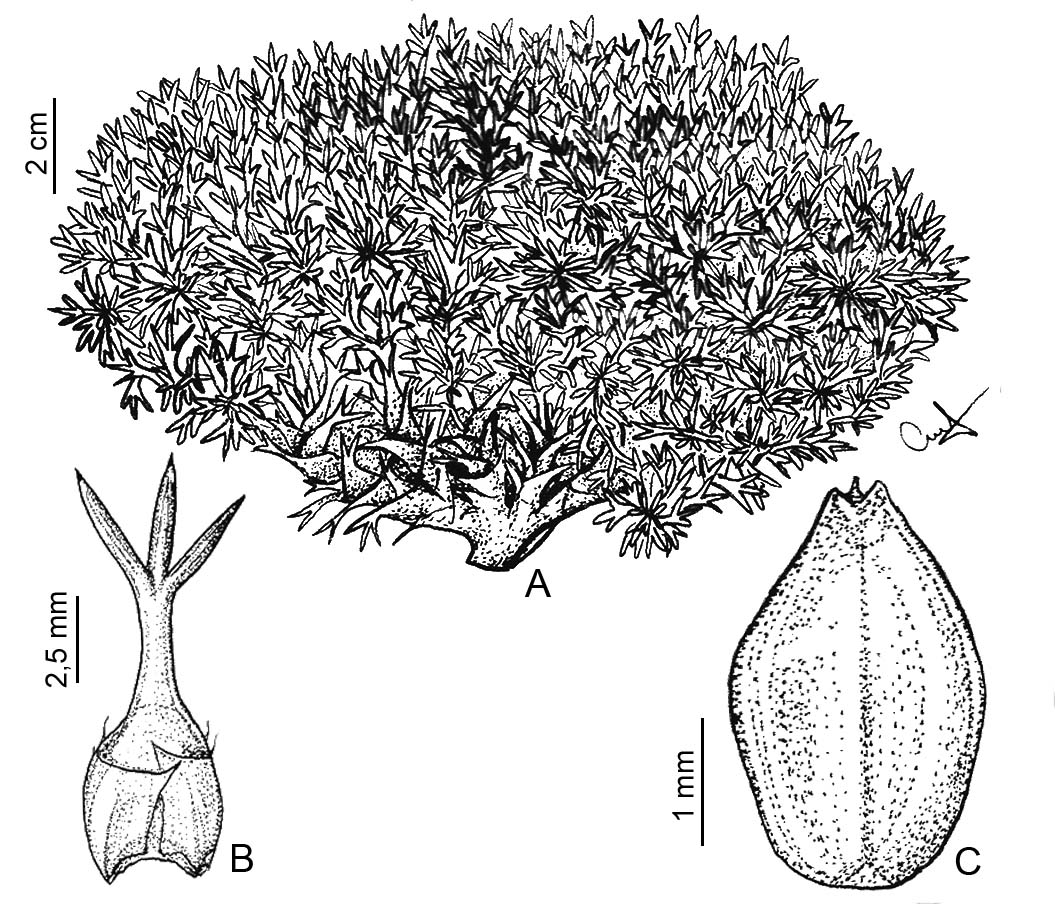 A. Fragmento del cojín. B. Hoja. C. Fruto, vista dorsal. Tomado de Anales Jard. Bot. Madrid 74: 22, fig. 9d-f. 2017.