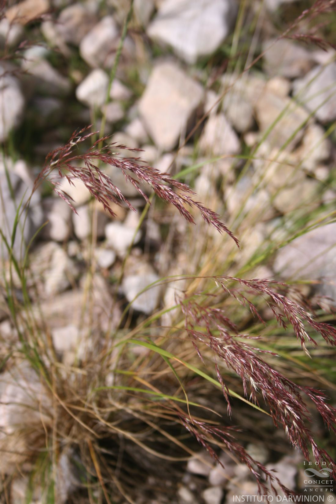 Plantas rizomatosas, con cortos rizomas; cañas erectas, de 70-100 cm de alto, césped más corto que las cañas; vainas glabras; lígulas membranáceas de 2-4 mm de largo; láminas conduplicadas, escabrosas, hasta de 18 cm x 0,5-1 mm, pulvinadas en la base. Inflorescencias de 12-18 x 1-2(-3) cm, subespiciformes, densamente espiculadas, violaceo-doradas, ramificaciones y pedicelos escabrosos. Glumas subiguales, de 5,4-6,6 mm de largo, la inferior 1-nervia, la superior 3-nervia, escabrosas sobre la quilla y el dorso; lemma de 3,8-4,6 mm de largo, escabrosa, ápice denticulado, arista dorsal de 4-5 mm de largo, inserta a (0,8-)1-1,6(-2) mm de la base, alcanzando la longitud de las glumas o sobrepasándolas brevemente; pálea membranácea, de 2,8-3,8 mm de largo, 2-nervia, nervios escabriúsculos; callo redondeado, pelos cortos; artejo inferior de la raquilla breve; raquilla de (1,2-)1,4-1,8 mm de largo, pelos ca. 1 mm de largo que no alcanzan el ápice de la pálea; lodículas 2, de 0,4-0,5 mm de largo, 2-lobuladas, lóbulos desiguales, agudos; estambres 3, anteras de (1-)1,2-1,9 mm de largo; ovario obpiriforme, algo giboso, estilos excéntricos, estigmas plumosos; cariopsis no vista.