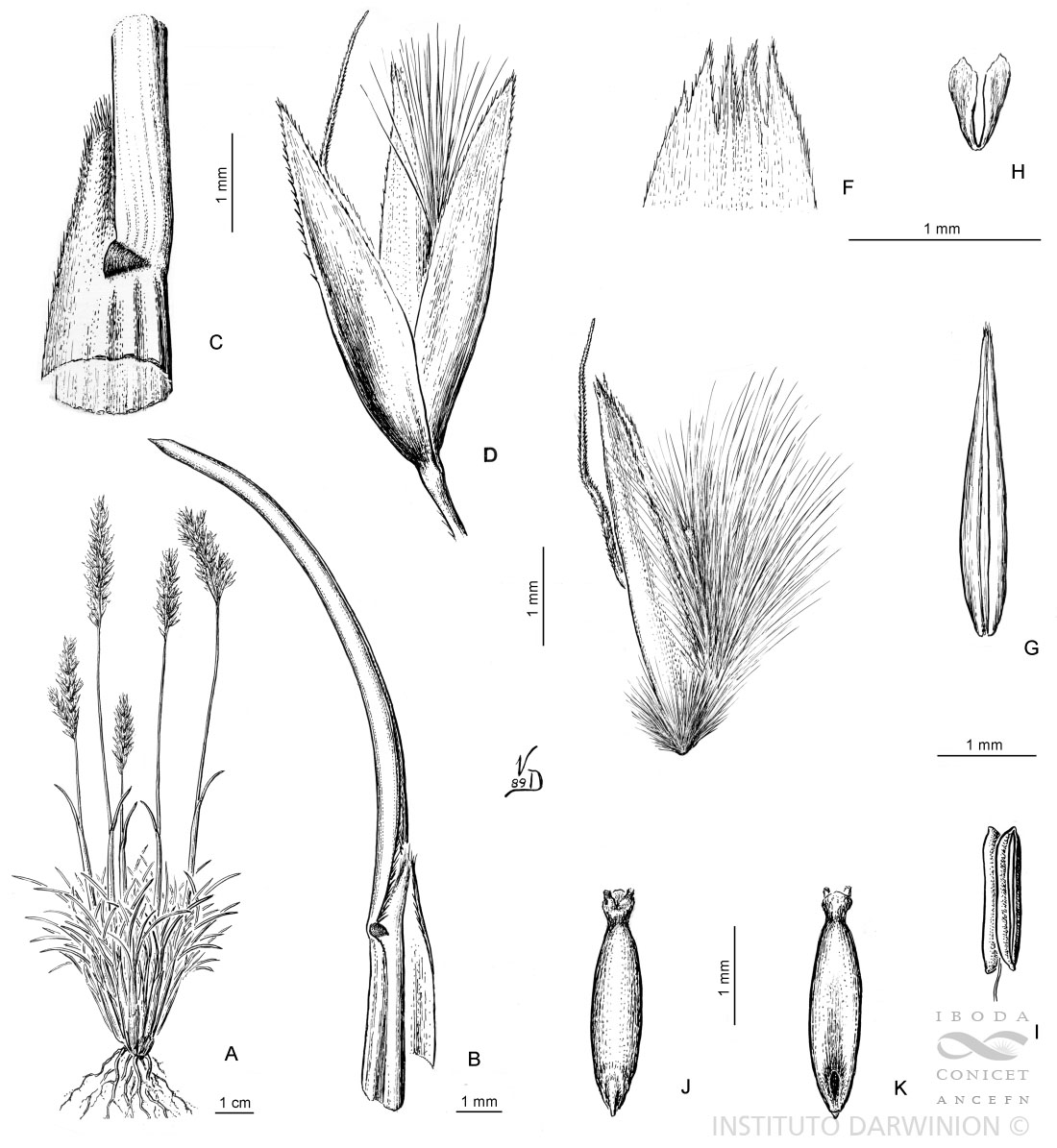 A. Planta. B. Hoja. C. Región ligular, vista lateral. D. Espiguilla, vista lateral. E. Antecio, vista lateral. F. Ápice de la lemma. G. Pálea, vista dorsal. H. Lodículas. I. Estambre. J. Cariopsis, vista escutelar. K. Cariopsis, vista hilar.