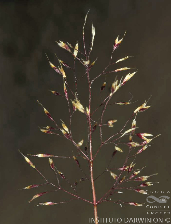 Plantas cespitosas, erectas, de 10-60 cm de alto; cañas glabras, a veces escabrosas debajo de la inflorescencia, generalmente 3-nodes; vainas lisas, glabras; lígulas generalmente de (0,8-3-)4,5-7 mm de largo, membranáceas, oblongas, agudas, borde brevemente laciniado, a veces con dos nervios laterales visibles; hojas formando un césped basal, notablemente más corto que las cañas floríferas; láminas de 6-26 cm x 1,5 mm, glabras, planas, o convolutas al secarse, de 0,2-0,5 mm de diámetro. Inflorescencia una panoja laxa, de 4,5-18 cm de largo, piramidal, ramificaciones laterales verticiladas, divergentes, glabras, de 2,5-8 cm de largo, pedicelos capiláceos, glabros, raro escabriúsculos, generalmente violáceos. Glumas de (3-)3,6-4,5(-5,5) mm de largo, iguales entre sí, dorso violáceo, blanquecinas hacia el ápice, agudas, glabras, o escabriúsculas, la inferior 1-nervia, la superior 3-nervia, excepcionalmente con escabrosidades aisladas en la quilla; lemma de (2,8-)3,4-3,9(-4,5) mm de largo, glabra, lisa, 5-nervia, ápice emarginado 4-dentado, arista de 3,6-7 mm de largo, escabriúscula, geniculada, retorcida, inserta a 0,3-0,5 mm de la base del dorso, superando a las glumas generalmente en 3 mm; pálea de 2,2-3,3 mm de largo, 2-nervia, ápice 2-4-denticulado, nervios y dorso glabros; callo redondeado, breve, pelos hasta de 1,5 mm de largo, alcanzando el ? inferior del antecio; artejo inferior de la raquilla cilíndrico, poco curvado, de 0,2-0,3 mm de largo, articulación glabra, dilatada; raquilla de (1-)1,5-2 mm de largo, con pelitos hasta de 1 mm de largo que generalmente no superan el ápice de la pálea, a veces alojados en el surco de la misma; flor perfecta; lodículas 2, de 0,4-0,5 mm de largo, membranáceas, agudas, 2-lobuladas, lóbulos desiguales; estambres 3, anteras violáceas de 1,6-2,5 mm de largo; cariopsis por lo general de 1,5-1,6 mm de largo, comprimida lateralmente, subgibosa en la cara ventral, surco poco notable, embrión breve, hilo elíptico, endosperma seco.