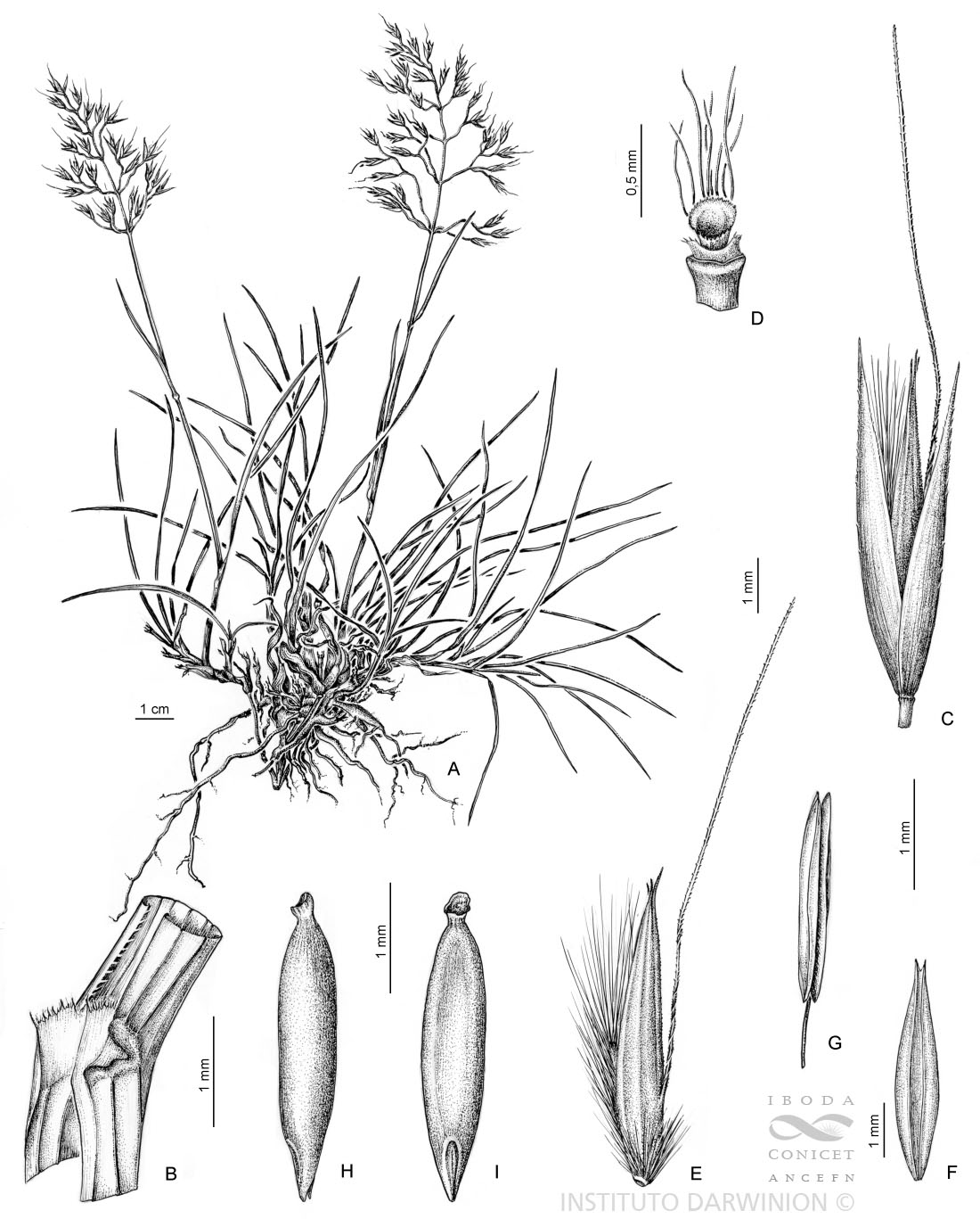 A. Planta. B. Región ligular. C. Espiguilla, vista lateral. D. Artejo inferior de la raquilla y parte del pedicelo. E. Antecio, vista lateral. F. Pálea, vista dorsal. G. Estambre. H. Cariopsis, vista lateral. I. Cariopsis, vista hilar.