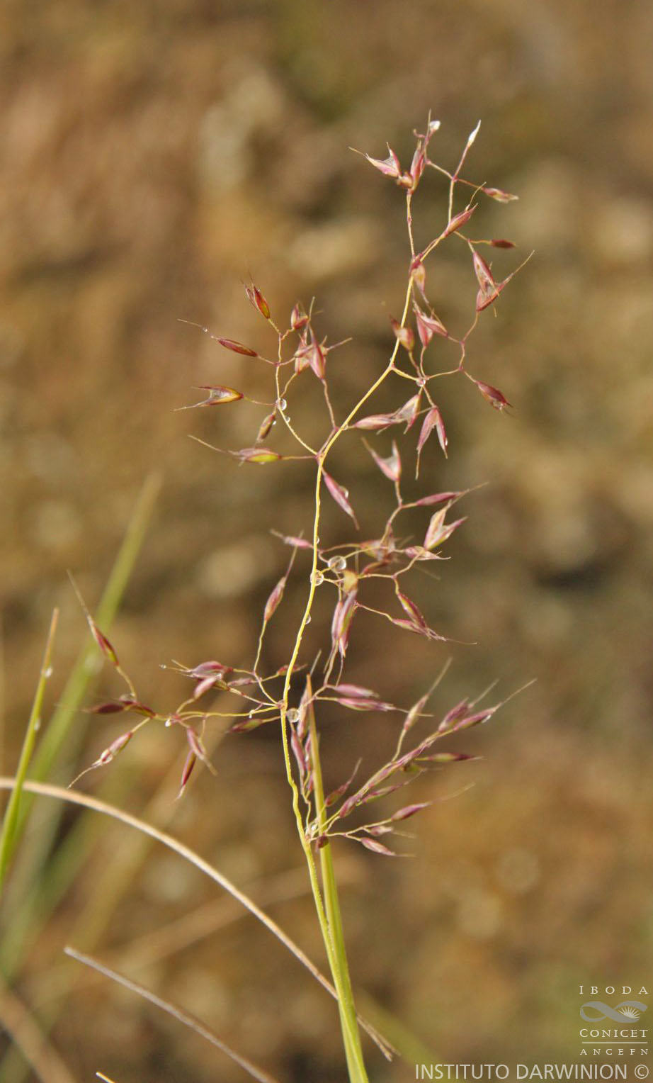 Plantas rizomatosas, rizomas estoloniformes, a veces oblícuos; cañas erectas de 6,5-56 cm de alto, glabras o tomentosas en el tercio superior, generalmente 3-nodes, nudos glabros; hojas formado césped poco menor que las cañas; vainas glabras o vainas de las innovaciones pubérulas y las de las hojas de la caña florífera glabras; lígulas de (0,6-)1-3,5 mm de largo, truncadas o subtrígonas, de ápice obtuso, membranáceas, borde finamente laciniado, lígulas de las innovaciones menores; láminas de 3-20 cm x 1-2 mm, conduplicadas al secarse, ápice navicular, glabras, a veces las láminas de las innovaciones pubérulas o con pelos cortos en la cara adaxial, pulvínulos basales desarrollados. Inflorescencia una panoja de 2-13 cm de largo, laxa, piramidal, exerta o subincluida, raquis glabro, escabriúsculo o hirsuto, ramificaciones verticiladas, erectas o patentes, capiláceas, escabriúsculas o hirsutas, las laterales basales de 1,5-5,5 cm de largo, pedicelos glabros, glabrescentes o hirsutos, patentes, tan largos o mayores que las espiguillas. Glumas la inferior 1-nervia de 4,5-5,7(-6) mm de largo, la superior 1-3-nervia, de (4,1-)5-6 mm de largo, violáceas, nervio medio escabroso; lemma de 4,6-5,5 mm de largo, 5-nervia, escabrosa en el dorso, ápice terminado en 4 arístulas escabriúsculas de 0,5-1,5 mm de largo, arista dorsal de 6,5-8 mm de largo, escabrosa, geniculada, retorcida en la base, inserta a (1-)1,2-2 mm de la base; pálea de 4,1-4,6 mm de largo, membranácea, 2-nervia, nervios escabriúsculos, ápice brevemente 2-dentado; callo breve, redondeado, piloso, pelos de 0,2-0,7 mm de largo, no alcanzando el tercio inferior del antecio; artejo inferior de la raquilla de 0,25-0,3 mm de largo, glabro o piloso en el dorso; raquilla de 1,6-2,4 mm de largo, pilosa, los pelos no alcanzan el ápice de la pálea, lo igualan o lo superan; lodículas 2, de 0,5-0,8 mm de largo, membranáceas, 2-lobuladas, lóbulos agudos, desiguales; estambres 3, anteras violáceas de 1,9-2,5 mm de largo; ovario oboide, estilos breves excéntricos, estigmas plumosos, blanquecinos; cariopsis de 2,8 mm de largo, comprimida lateralmente, surco ventral poco profundo, embrión breve, hilo elíptico, endorsperma seco.