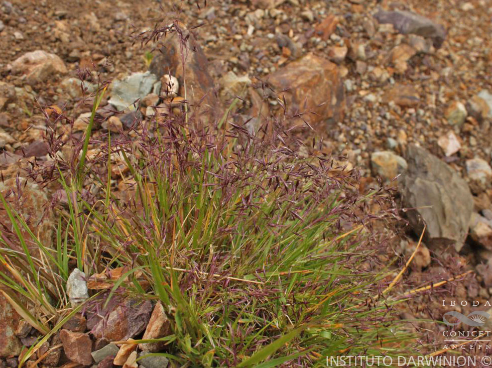 Plantas rizomatosas, rizomas estoloniformes, a veces oblícuos; cañas erectas de 6,5-56 cm de alto, glabras o tomentosas en el tercio superior, generalmente 3-nodes, nudos glabros; hojas formado césped poco menor que las cañas; vainas glabras o vainas de las innovaciones pubérulas y las de las hojas de la caña florífera glabras; lígulas de (0,6-)1-3,5 mm de largo, truncadas o subtrígonas, de ápice obtuso, membranáceas, borde finamente laciniado, lígulas de las innovaciones menores; láminas de 3-20 cm x 1-2 mm, conduplicadas al secarse, ápice navicular, glabras, a veces las láminas de las innovaciones pubérulas o con pelos cortos en la cara adaxial, pulvínulos basales desarrollados. Inflorescencia una panoja de 2-13 cm de largo, laxa, piramidal, exerta o subincluida, raquis glabro, escabriúsculo o hirsuto, ramificaciones verticiladas, erectas o patentes, capiláceas, escabriúsculas o hirsutas, las laterales basales de 1,5-5,5 cm de largo, pedicelos glabros, glabrescentes o hirsutos, patentes, tan largos o mayores que las espiguillas. Glumas la inferior 1-nervia de 4,5-5,7(-6) mm de largo, la superior 1-3-nervia, de (4,1-)5-6 mm de largo, violáceas, nervio medio escabroso; lemma de 4,6-5,5 mm de largo, 5-nervia, escabrosa en el dorso, ápice terminado en 4 arístulas escabriúsculas de 0,5-1,5 mm de largo, arista dorsal de 6,5-8 mm de largo, escabrosa, geniculada, retorcida en la base, inserta a (1-)1,2-2 mm de la base; pálea de 4,1-4,6 mm de largo, membranácea, 2-nervia, nervios escabriúsculos, ápice brevemente 2-dentado; callo breve, redondeado, piloso, pelos de 0,2-0,7 mm de largo, no alcanzando el tercio inferior del antecio; artejo inferior de la raquilla de 0,25-0,3 mm de largo, glabro o piloso en el dorso; raquilla de 1,6-2,4 mm de largo, pilosa, los pelos no alcanzan el ápice de la pálea, lo igualan o lo superan; lodículas 2, de 0,5-0,8 mm de largo, membranáceas, 2-lobuladas, lóbulos agudos, desiguales; estambres 3, anteras violáceas de 1,9-2,5 mm de largo; ovario oboide, estilos breves excéntricos, estigmas plumosos, blanquecinos; cariopsis de 2,8 mm de largo, comprimida lateralmente, surco ventral poco profundo, embrión breve, hilo elíptico, endorsperma seco.