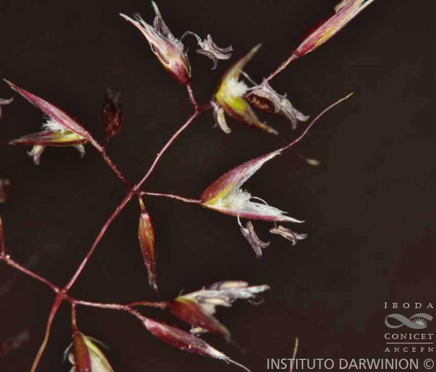 Plantas rizomatosas, rizomas estoloniformes, a veces oblícuos; cañas erectas de 6,5-56 cm de alto, glabras o tomentosas en el tercio superior, generalmente 3-nodes, nudos glabros; hojas formado césped poco menor que las cañas; vainas glabras o vainas de las innovaciones pubérulas y las de las hojas de la caña florífera glabras; lígulas de (0,6-)1-3,5 mm de largo, truncadas o subtrígonas, de ápice obtuso, membranáceas, borde finamente laciniado, lígulas de las innovaciones menores; láminas de 3-20 cm x 1-2 mm, conduplicadas al secarse, ápice navicular, glabras, a veces las láminas de las innovaciones pubérulas o con pelos cortos en la cara adaxial, pulvínulos basales desarrollados. Inflorescencia una panoja de 2-13 cm de largo, laxa, piramidal, exerta o subincluida, raquis glabro, escabriúsculo o hirsuto, ramificaciones verticiladas, erectas o patentes, capiláceas, escabriúsculas o hirsutas, las laterales basales de 1,5-5,5 cm de largo, pedicelos glabros, glabrescentes o hirsutos, patentes, tan largos o mayores que las espiguillas. Glumas la inferior 1-nervia de 4,5-5,7(-6) mm de largo, la superior 1-3-nervia, de (4,1-)5-6 mm de largo, violáceas, nervio medio escabroso; lemma de 4,6-5,5 mm de largo, 5-nervia, escabrosa en el dorso, ápice terminado en 4 arístulas escabriúsculas de 0,5-1,5 mm de largo, arista dorsal de 6,5-8 mm de largo, escabrosa, geniculada, retorcida en la base, inserta a (1-)1,2-2 mm de la base; pálea de 4,1-4,6 mm de largo, membranácea, 2-nervia, nervios escabriúsculos, ápice brevemente 2-dentado; callo breve, redondeado, piloso, pelos de 0,2-0,7 mm de largo, no alcanzando el tercio inferior del antecio; artejo inferior de la raquilla de 0,25-0,3 mm de largo, glabro o piloso en el dorso; raquilla de 1,6-2,4 mm de largo, pilosa, los pelos no alcanzan el ápice de la pálea, lo igualan o lo superan; lodículas 2, de 0,5-0,8 mm de largo, membranáceas, 2-lobuladas, lóbulos agudos, desiguales; estambres 3, anteras violáceas de 1,9-2,5 mm de largo; ovario oboide, estilos breves excéntricos, estigmas plumosos, blanquecinos; cariopsis de 2,8 mm de largo, comprimida lateralmente, surco ventral poco profundo, embrión breve, hilo elíptico, endorsperma seco.