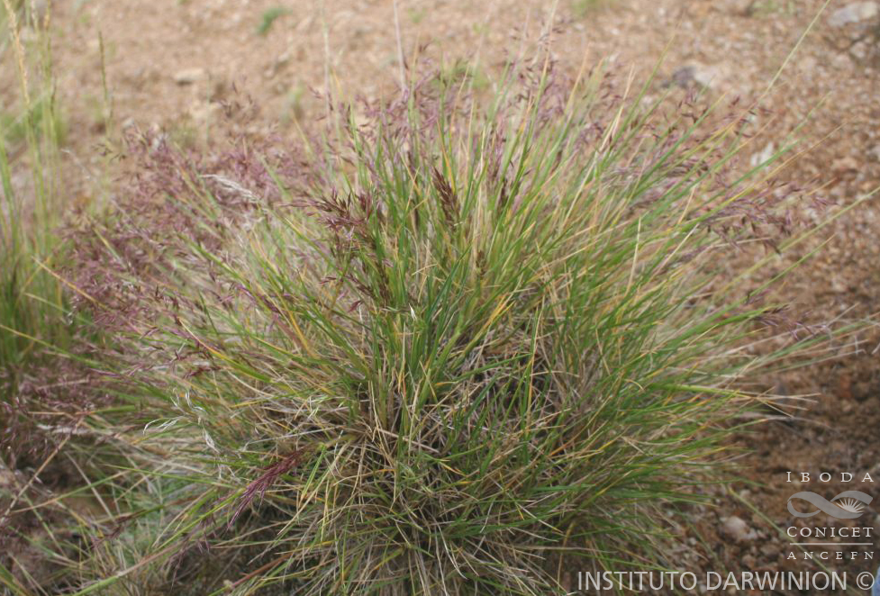 Plantas rizomatosas, rizomas estoloniformes, a veces oblícuos; cañas erectas de 6,5-56 cm de alto, glabras o tomentosas en el tercio superior, generalmente 3-nodes, nudos glabros; hojas formado césped poco menor que las cañas; vainas glabras o vainas de las innovaciones pubérulas y las de las hojas de la caña florífera glabras; lígulas de (0,6-)1-3,5 mm de largo, truncadas o subtrígonas, de ápice obtuso, membranáceas, borde finamente laciniado, lígulas de las innovaciones menores; láminas de 3-20 cm x 1-2 mm, conduplicadas al secarse, ápice navicular, glabras, a veces las láminas de las innovaciones pubérulas o con pelos cortos en la cara adaxial, pulvínulos basales desarrollados. Inflorescencia una panoja de 2-13 cm de largo, laxa, piramidal, exerta o subincluida, raquis glabro, escabriúsculo o hirsuto, ramificaciones verticiladas, erectas o patentes, capiláceas, escabriúsculas o hirsutas, las laterales basales de 1,5-5,5 cm de largo, pedicelos glabros, glabrescentes o hirsutos, patentes, tan largos o mayores que las espiguillas. Glumas la inferior 1-nervia de 4,5-5,7(-6) mm de largo, la superior 1-3-nervia, de (4,1-)5-6 mm de largo, violáceas, nervio medio escabroso; lemma de 4,6-5,5 mm de largo, 5-nervia, escabrosa en el dorso, ápice terminado en 4 arístulas escabriúsculas de 0,5-1,5 mm de largo, arista dorsal de 6,5-8 mm de largo, escabrosa, geniculada, retorcida en la base, inserta a (1-)1,2-2 mm de la base; pálea de 4,1-4,6 mm de largo, membranácea, 2-nervia, nervios escabriúsculos, ápice brevemente 2-dentado; callo breve, redondeado, piloso, pelos de 0,2-0,7 mm de largo, no alcanzando el tercio inferior del antecio; artejo inferior de la raquilla de 0,25-0,3 mm de largo, glabro o piloso en el dorso; raquilla de 1,6-2,4 mm de largo, pilosa, los pelos no alcanzan el ápice de la pálea, lo igualan o lo superan; lodículas 2, de 0,5-0,8 mm de largo, membranáceas, 2-lobuladas, lóbulos agudos, desiguales; estambres 3, anteras violáceas de 1,9-2,5 mm de largo; ovario oboide, estilos breves excéntricos, estigmas plumosos, blanquecinos; cariopsis de 2,8 mm de largo, comprimida lateralmente, surco ventral poco profundo, embrión breve, hilo elíptico, endorsperma seco.