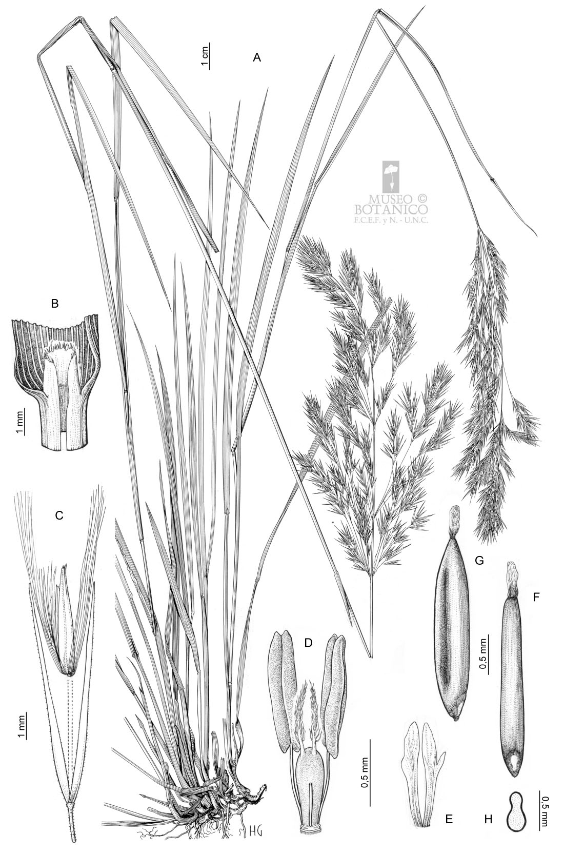 Plantas perennes, erectas, con rizomas cortos provistos de yemas con catafilos castaño-amarillentos a rojizos; cañas de 0,60-1,30 m de altura, nudos glabros, los inferiores mas aproximados; vainas glabras, pubescentes o escabrosas, mayores que los entrenudos; lígulas de 1-1,5 mm de largo, membranáceas, truncadas, borde brevemente laciniado; láminas planas de 8-30 cm x 3-10 mm, convolutas al secarse, glabras. Inflorescencia de 15-30 cm de largo, laxa, oblonga, contraída, decumbente, raquis glabro o escabriúsculo, ramificaciones inferiores hasta de 15 cm de largo, pedicelos escabrosos, menores que las espiguillas. Glumas de 5-6,5 mm de largo, linear-lanceoladas, acuminadas, 1-nervias, nervios escabrosos; lemma de 3,5-4 mm de largo, membranácea, escabrosa, 5-nervia, nervios visibles en toda su longitud, ápice truncado-denticulado, con una pequeña escotadura, arista de 1-5 mm de largo, geniculada, escabrosa, inserta en el tercio superior del dorso; pálea de 3-3,1 mm de largo, membranácea, 2-nervia, bicarinada, nervios escabrosos, ápice bífido; callo recurvado, piloso, los pelos sobrepasan al antecio; raquilla ca. ½ de la longitud del antecio, con pocos pelos en el ápice; lodículas 2, de 0,5-0,7 mm de largo, membranáceas; estambres 3, anteras de 0,5-0,7 mm de largo; ovario con dos estilos y estigmas plumosos; cariopsis fusiforme, comprimida lateralmente, generalmente de 2-3 mm de largo, hilo estrechamente elíptico, embrión de 0,4 mm de largo, endosperma blando, estigmas persistentes.