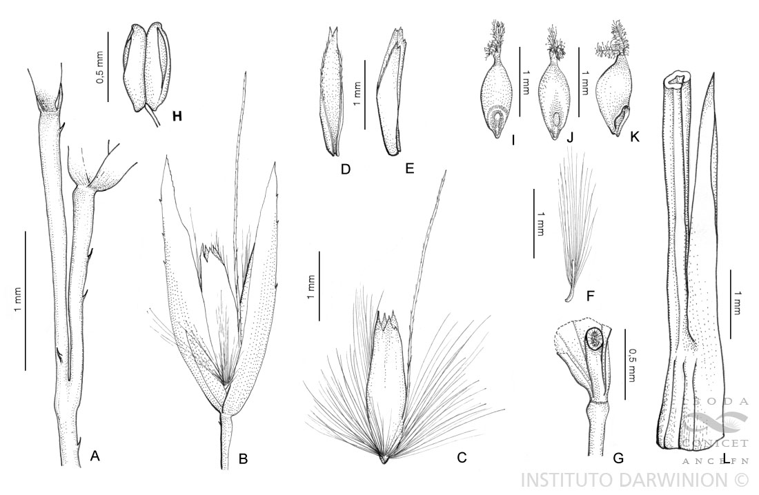 A. Pedicelos. B. Espiguilla, vista lateral. C. Antecio, vista lateral. D – E. Pálea. F. Raquilla. G. Artejo inferior de la raquilla y parte de la gluma superior. I. Cariopsis, vista escutelar. J. Cariopsis, vista hilar. K. Cariopsis, vista lateral. L. Región ligular.