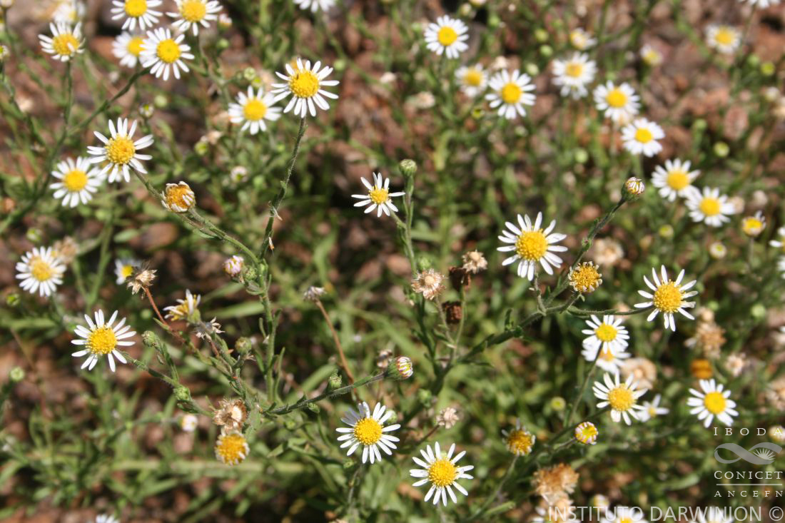 Hierbas anuales, raíz primaria desarrollada, hasta de 50 cm de alto, con tallos ramificados, hojosos, laxamente pilosos y densamente glandulosos. Hojas linear-elípticas, de 15-60 × 1-3 mm, base atenuada, ápice agudo, margen entero (o remotamente dentado), glandulosas y con pocos pelos largos. Capítulos solitarios, pedunculados, de 5-7 × ca. 10 mm. Involucro hemisférico, con filarios algo desiguales dispuestos en 2 series, ovados a linear-ovados, de 3,3-4,2 × 0,5-0,9 mm, agudos, hirsutos, laxamente glandulosos. Flores marginales dispuestas en 1 serie, con corola blanca, de 5-7,5 mm de largo, limbo de 3,5-5 × ca. 0,7- 1 mm; flores del centro con corola de 2,2-4 mm de largo. Aquenios obovoides, algo comprimidos, de 1,5-2 × 0,5 mm, con 4 nervios, seríceos. Papus formado por 2 series, una externa de cerdas cortas y una interna de cerdas escabrosas de 2-3,2 mm de largo.