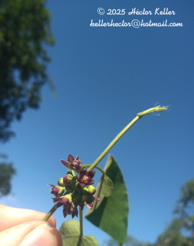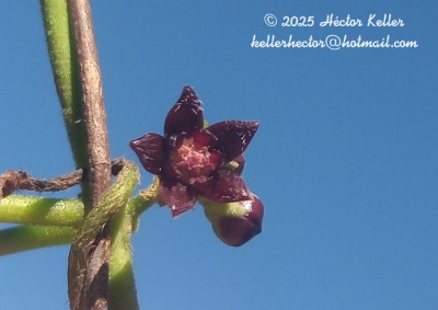 Voluble, hasta de 4 m de alto; tallos suberificados; ramas con pubescencia mixta. Hojas con pecíolo de 3-5 cm de largo, finamente pubescente; lámina ovada, de 7-11 × 3-7 cm, ápice acuminado, base cordada, pubescente, con coléteres en la base adaxial de la vena media. Inflorescencias umbeliformes, multifloras, pedúnculo de 1-3 mm de largo. Flores con pedicelo pubescente de 3-5 mm de largo; cáliz con coléteres en el seno, lóbulos ovado-triangulares, de 2,5 × 1,5 mm, glabros; corola subcampanulada, morada, lóbulos ovado-acuminados, de 3,5-4 × 2,2-3 mm, con tricomas blancos y largos en el ápice de la cara adaxial; corona ginostegial glabra, morada, con 5 lóbulos oblongos, de 1,8-2,7 × 1 mm, 2-fidos, curvos sobre el margen del ginostegio; ginostegio subsésil de 1 mm de alto, con cabeza estilar 5-gonal, cóncava, provista de dos pequeñas protuberancias en el centro; retináculo oblanceolado, de 0,20 × 0,10 mm; caudículas de 0,22 mm de largo; polinios ovados, de 0,50 × 0,30-0,40 mm, aplanados. Frutos ovoides, de 8 × 3 cm, muricados, cubierto de protuberancias suberificadas, blancas. Semillas obovadas, de 8 × 6 mm, castañas, verrucosas, ápice dentado.