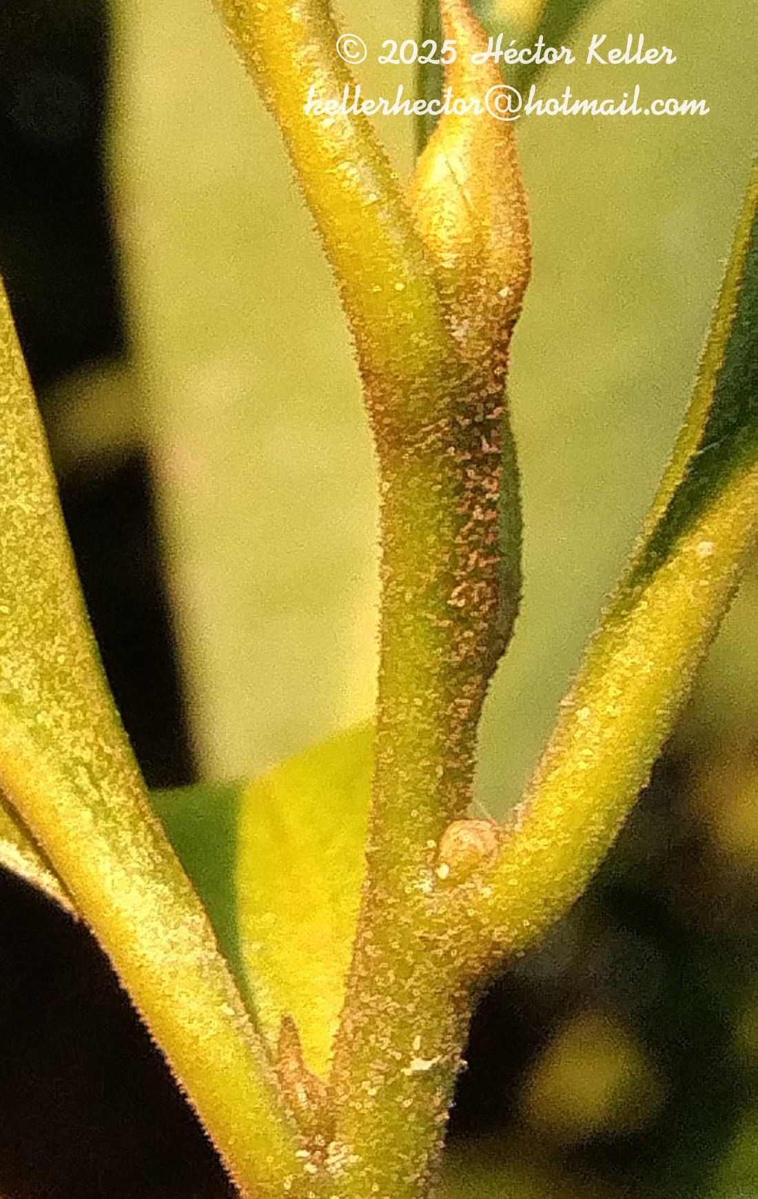 Arbustos de 1-2 m de alto, con las ramas terminales de 1-2 mm de diámetro, lisas, glabras. Hojas ovadas a lanceoladas, de 5-8 × 1-2,5 cm, glabras, de ápice agudo y base aguda-decurrente, margen generalmente no revoluto, con cavidades secretoras globosas en su superficie, membranáceas; pecíolo de 5-7 mm de largo. Inflorescencias estaminadas y pistiladas 6-10-floras, con pedúnculo de 1 mm de largo; brácteas triangulares, de 0,7 mm de largo, con tricomas. Flores 4(-5)-meras, de 3-4(-5) mm de largo, pedicelos de 1-2 mm de largo; sépalos triangulares, de 1 mm de largo, ciliados y con cavidades secretoras globosas, dispersas y con contenido claro; corola con lóbulos lanceolado-elípticos, de 1,5-3 × 0,7 mm, de ápice obtuso y ciliados, con cavidades secretoras anchas, globulares y elípticas, raramente lineares; estambres de 1 mm de largo, estaminodios de 0,8-1 mm de largo, filamentos connados; ovario globular y pistilodio de 1 × 1 mm; estigma cónico, de 2 mm de largo, 4-lobado. Fruto globoso, de 4 × 3,5 mm, pericarpio con pequeñas cavidades secretoras. Semillas no vistas.
