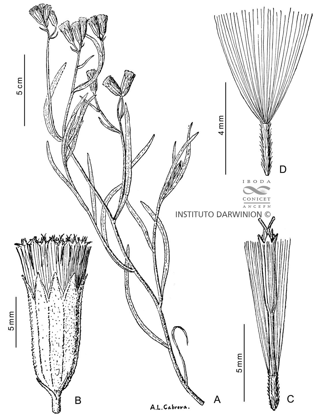 A. Rama florífera. B. Capítulo. C. Flor. D. Aquenio y papus.