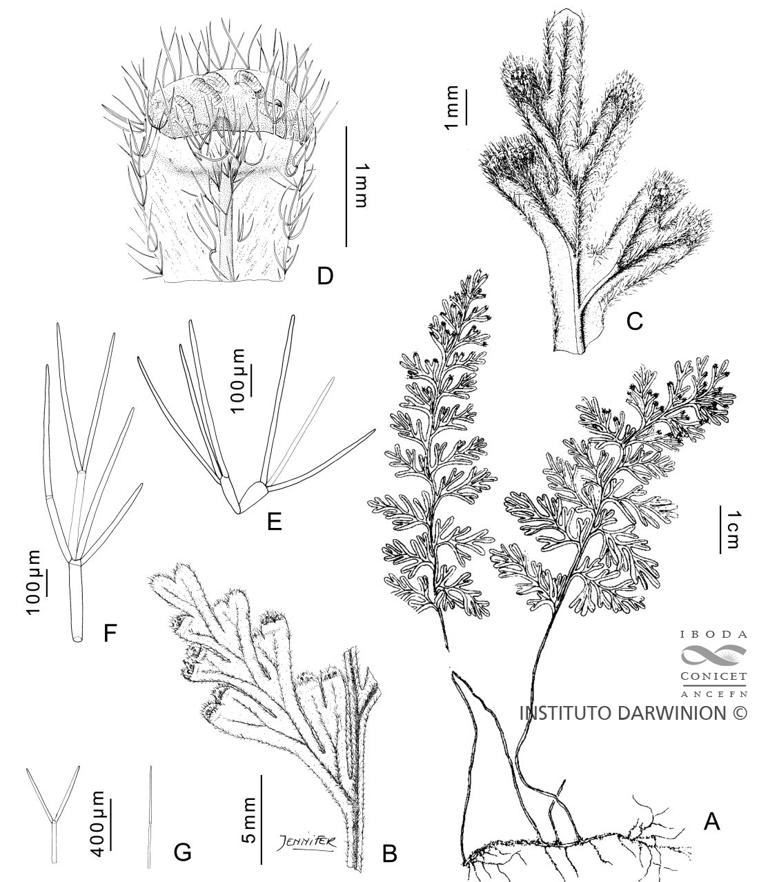 A. Planta. B. Detalle de una pinna. C. Ápice de una lámina. D. Detalle de un indusio. E-F. Pelos del margen de la lámina. G. Pelos del pecíolo.