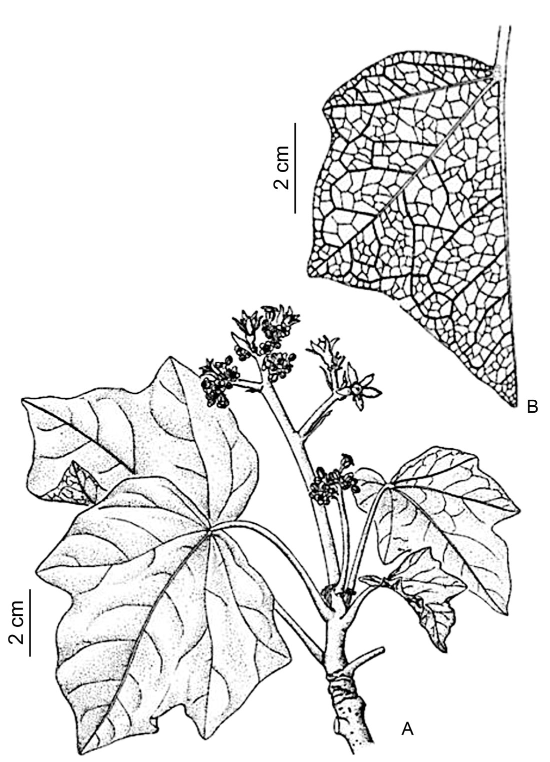 Árbol diclino-monoico, hasta de 15 m de alto, glabro. Hojas con pecíolos delgados, de 4-15 cm de largo; estípulas pequeñas; lámina orbicular u ovada, de 5-11 × 5-11 cm, 3-5-lobada, en ocasiones subentera, base cordada, lóbulos con el ápice acuminado o agudo, pubescentes sobre las nervaduras en la cara abaxial; venación palmada. Inflorescencias en cimas compuestas, más breves que las hojas; pedúnculos pubescentes; brácteas lanceoladas, ca. 5 mm de largo. Flores estaminadas con sépalos elípticos u ovados, ca. 4 mm de largo, obtusos, casi libres; pétalos elípticos, ca. 6 mm de largo, soldados, lanosos en la cara ventral, amarillo-verdosos; disco nectarífero con 5 glándulas libres; estambres 10, en dos ciclos, los exteriores casi libres, los interiores monadelfos, glabros. Flores pistiladas con los sépalos elípticos, de 6-8 mm de largo, agudos, apenas connados; pétalos elípticos, de 8-9 mm de largo, agudos, pubescentes en la cara ventral, amarillo-verdosos; disco con 5 glándulas libres; ovario subgloboso, glabro, estilos 3, estigmas 2-fidos. Fruto una cápsula elipsoide, ca. 3 cm de largo, tardíamente dehiscente. Semillas de contorno oblongo, de 18-20 mm de largo, negruzcas, reticuladas.