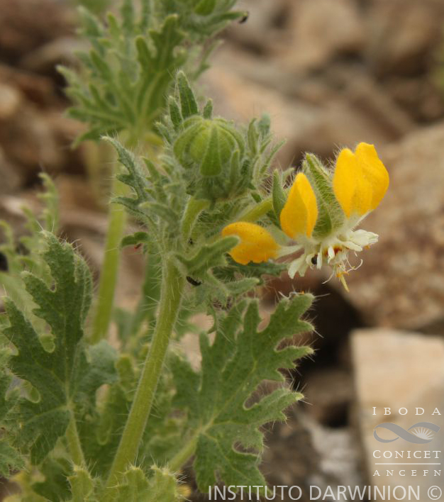 Planta hasta de 0,50 m de alto, con pubescencia de tricomas urticantes largos de base ensanchada, tricomas escabrosos y gloquidiados; tallos ascendentes a erguidos, pubescentes. Hojas opuestas, pubescentes; pecíolos hasta de 50 mm de largo; láminas inferiores ovadas o elípticas, pinnati a palmatilobadas, las restantes ovadas, profundamente palmatisectas, de 15-70 × 12-60 mm, cara abaxial con predominio de tricomas gloquidiados. Inflorescencias en monocasios y/o dicasios terminales; brácteas foliosas sésiles o brevemente pecioladas, pubescentes. Flores5-meras; cáliz con segmentos estrechamente subovados o estrechamente subtriangulares, de 6-13,5 mm de largo en la flor y hasta de 18 mm de largo en el fruto, reflexos, pubescencia con tricomas largos dispuestos principalmente en el borde y en la cara exterior; pétalos 5, cuculados, de 11-15,5 × 4-8 mm y 3-5 mm de profundidad, reflexos, suavemente ondulados, amarillos o, raras veces, anaranjados, con la uña blanca, pubescentes en la cara externa; escamas nectaríferas subovadas, de 3,5-6 × 2-3 mm, principalmente blancas, con manchas rojas de bordes amarillos en la base o el medio, papilosas en el borde y en la mitad inferior dorsal, cóncavas, sacciformes en la mitad inferior, con un doble arco en forma de “m” en el ápice, dorso de la escama con 3 quillas longitudinales, la central poco desarrollada, en el tercio inferior del dorso con 3 apéndices aplanados lateralmente, generalmente blancos, ocasionalmente con pequeñas manchas rojas a amarillas, subfalcados, con menos frecuencia elípticos, ovados u obovados, de 2-4 mm de largo, con una prolongación filiforme de 0,5-2,5 mm de largo en el borde anterior del tercio superior, margen entero; estaminodios de 6-9 mm de largo, 2 por escama nectarífera, papilosos en la parte inferior, subulados, algo curvados o sinuados y con una pequeña bifurcación en la base del tercio superior; estambres en fascículos de 13-16; filamentos de 5-12,5 mm de largo; anteras anchamente elipsoideas, de 0,7-1 mm de largo; ovario de obcónico hasta anchamente obcónico, de 2-5 × ± 3 mm de diámetro en la parte superior, pubescente, óvulos 9-12; estilo de 2,5-6 mm de largo, piloso, a veces casi hasta el ápice, 3-fido, con torsión en fruto. Frutos cápsulas de 10-18 × 8-13 mm diámetro en la parte superior, obcónicas, pubescentes, deflexas cuando inmaduras, erguidas cuando maduras, dehiscentes por 3 valvas. Semillas 9-12, elipsoides u obovoides, de 3-5 × 2-2,8 mm, rugosas con zonas indistintamente reticuladas.