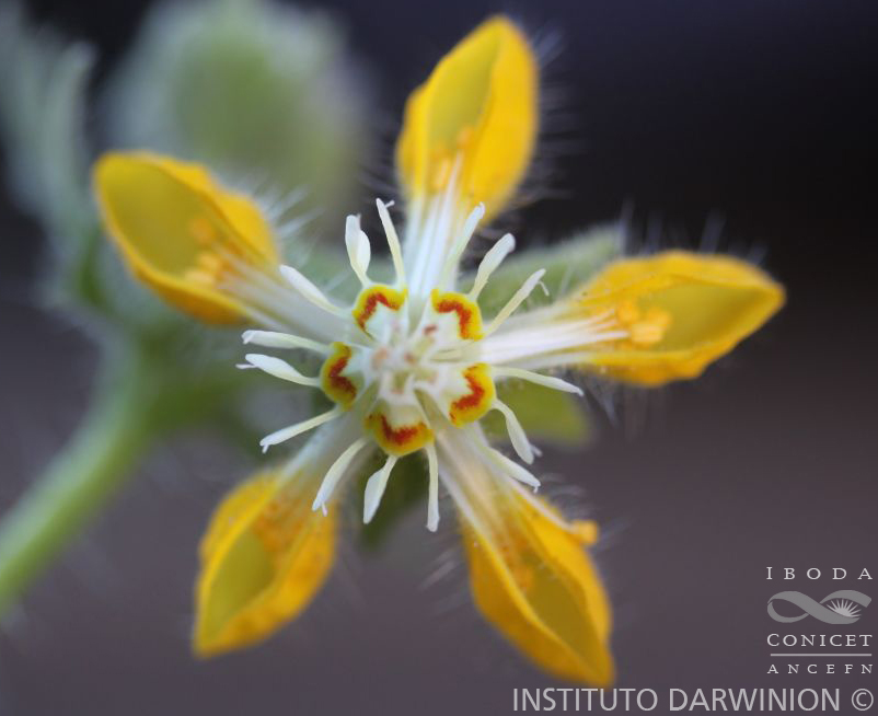 Planta hasta de 0,50 m de alto, con pubescencia de tricomas urticantes largos de base ensanchada, tricomas escabrosos y gloquidiados; tallos ascendentes a erguidos, pubescentes. Hojas opuestas, pubescentes; pecíolos hasta de 50 mm de largo; láminas inferiores ovadas o elípticas, pinnati a palmatilobadas, las restantes ovadas, profundamente palmatisectas, de 15-70 × 12-60 mm, cara abaxial con predominio de tricomas gloquidiados. Inflorescencias en monocasios y/o dicasios terminales; brácteas foliosas sésiles o brevemente pecioladas, pubescentes. Flores5-meras; cáliz con segmentos estrechamente subovados o estrechamente subtriangulares, de 6-13,5 mm de largo en la flor y hasta de 18 mm de largo en el fruto, reflexos, pubescencia con tricomas largos dispuestos principalmente en el borde y en la cara exterior; pétalos 5, cuculados, de 11-15,5 × 4-8 mm y 3-5 mm de profundidad, reflexos, suavemente ondulados, amarillos o, raras veces, anaranjados, con la uña blanca, pubescentes en la cara externa; escamas nectaríferas subovadas, de 3,5-6 × 2-3 mm, principalmente blancas, con manchas rojas de bordes amarillos en la base o el medio, papilosas en el borde y en la mitad inferior dorsal, cóncavas, sacciformes en la mitad inferior, con un doble arco en forma de “m” en el ápice, dorso de la escama con 3 quillas longitudinales, la central poco desarrollada, en el tercio inferior del dorso con 3 apéndices aplanados lateralmente, generalmente blancos, ocasionalmente con pequeñas manchas rojas a amarillas, subfalcados, con menos frecuencia elípticos, ovados u obovados, de 2-4 mm de largo, con una prolongación filiforme de 0,5-2,5 mm de largo en el borde anterior del tercio superior, margen entero; estaminodios de 6-9 mm de largo, 2 por escama nectarífera, papilosos en la parte inferior, subulados, algo curvados o sinuados y con una pequeña bifurcación en la base del tercio superior; estambres en fascículos de 13-16; filamentos de 5-12,5 mm de largo; anteras anchamente elipsoideas, de 0,7-1 mm de largo; ovario de obcónico hasta anchamente obcónico, de 2-5 × ± 3 mm de diámetro en la parte superior, pubescente, óvulos 9-12; estilo de 2,5-6 mm de largo, piloso, a veces casi hasta el ápice, 3-fido, con torsión en fruto. Frutos cápsulas de 10-18 × 8-13 mm diámetro en la parte superior, obcónicas, pubescentes, deflexas cuando inmaduras, erguidas cuando maduras, dehiscentes por 3 valvas. Semillas 9-12, elipsoides u obovoides, de 3-5 × 2-2,8 mm, rugosas con zonas indistintamente reticuladas.