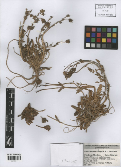Observaciones: Esta especie se conoce solamente del material tipo. La mayoría de ejemplares determinados bajo el nombre Loasa incurva en los herbarios, corresponden a Pinnasa kurtzii, una especie endémica de Mendoza, con pétalos generalmente blancos. Ver observaciones bajo esa especie.