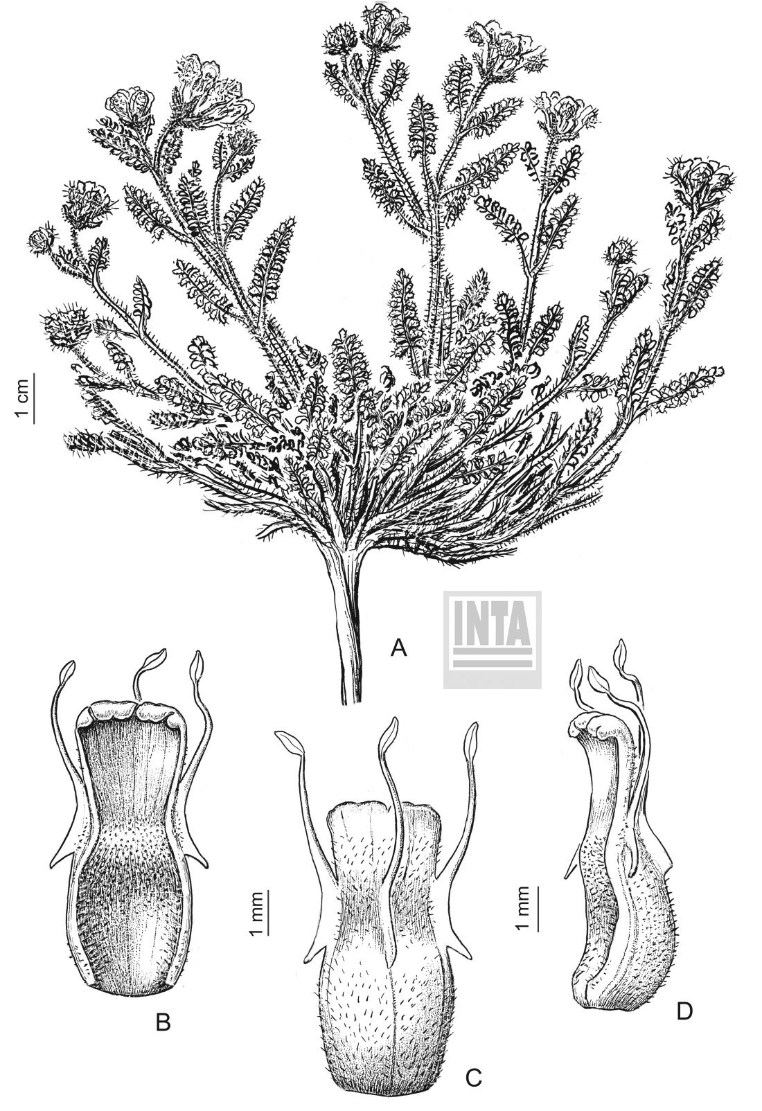 A. Planta en flor. B-D. Escama nectarífera.